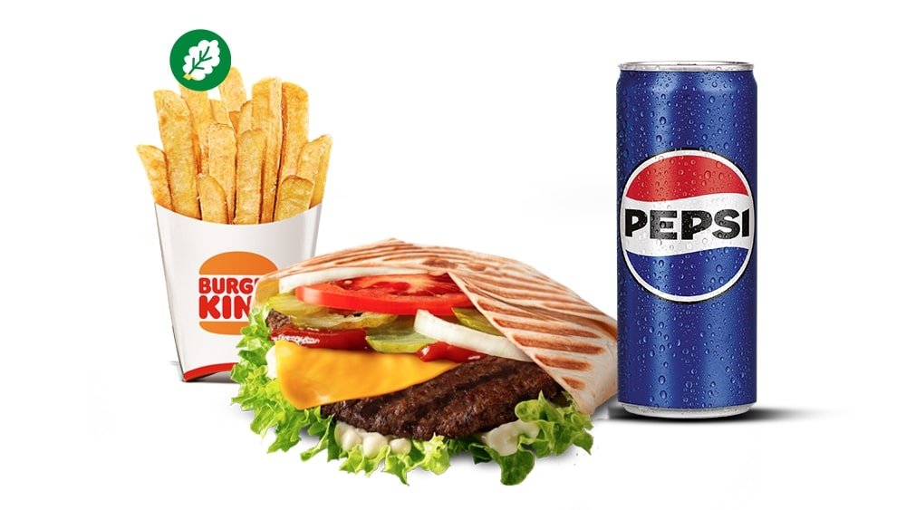 A beef pocket with the same taste but 0% meat? That's a Plant-Based Pocket! Enjoy a plant-based slice, pickle, tomato, iceberg lettuce with mayo and ketchup in a baked tortilla! This is not a vegetarian or vegan product. The menu also includes medium fries and a 0.33L drink.