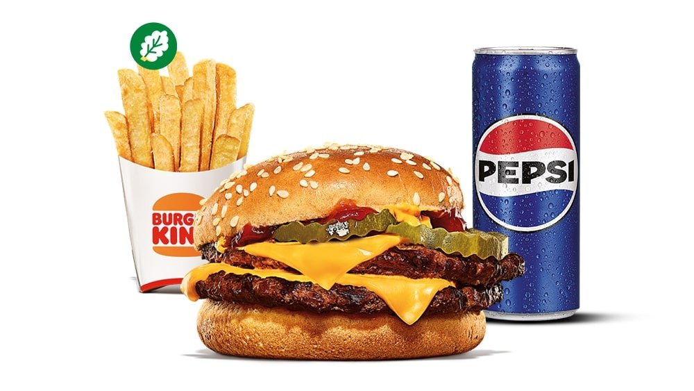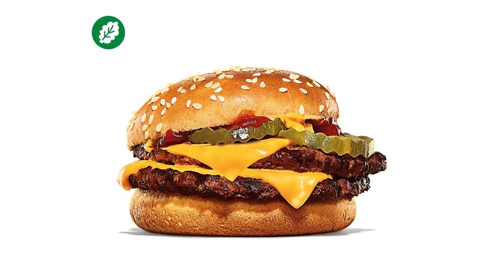 Je 100% DOUBLE CHEESEBURGER, ale s 0 % hovězího masa. Má stejné složení jako náš klasický Cheeseburger, tedy sýr čedar, nakládané okurky, hořčice a kečup v kombinaci s rostlinným plátkem v teplé opečené housce sypané sezamem. Navíc ve výhodném menu.