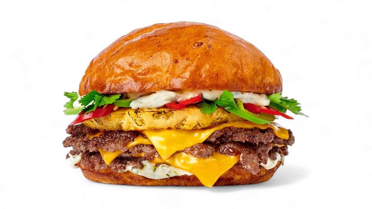 3 x české hovězí z Amasa, grilovaný ananas, čedar, jalapeňo, koriandr, limetová Mayo
