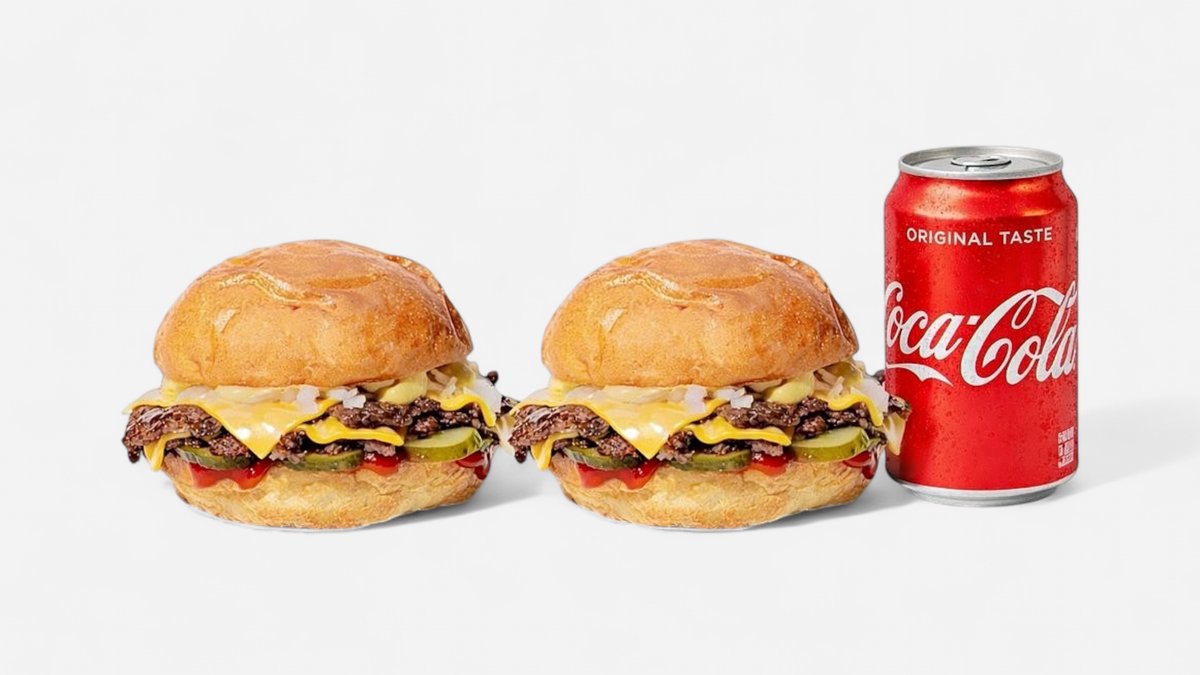 2 x Double Cheese (české hovězí z Amasa, čedar, kečup, hořčice, cibule, nakládaná okurka) & Coca Cola