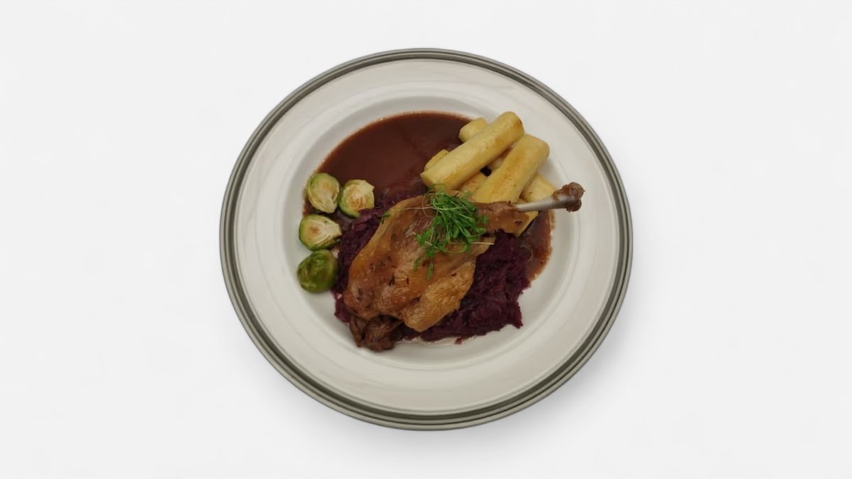 Konfitované kachní stehno, dušené červené zelí, bramborové noky, růžičková kapusta A. 1,3,7,9