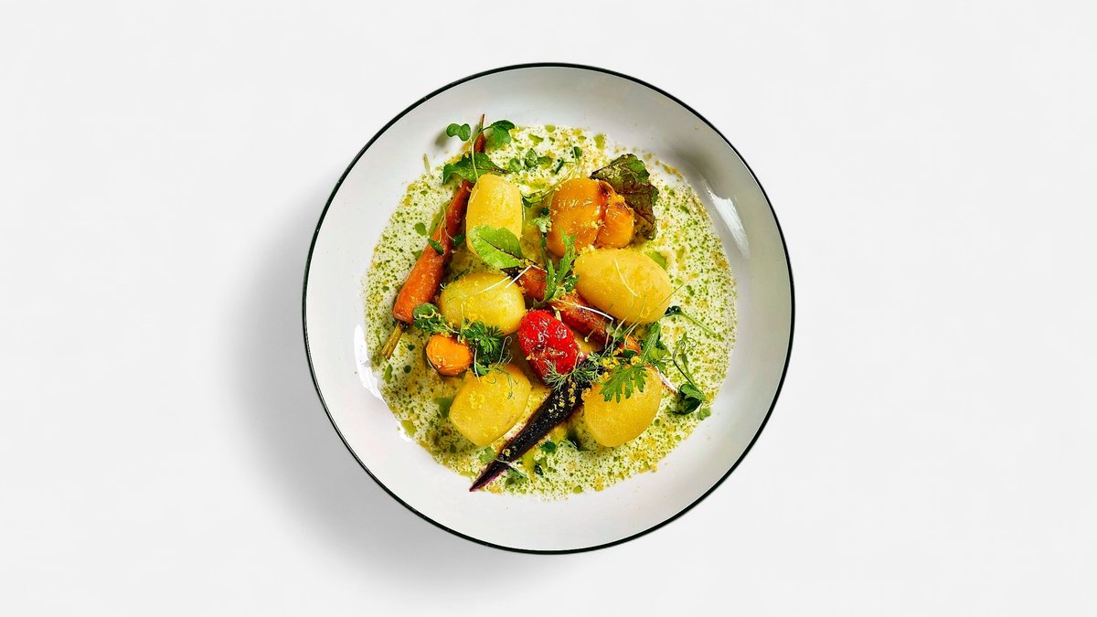 Papriky plněné sýrem feta, konfitované brambory, mladá karotka, kefírová omáčka, sušený žloutek A. 3,7
