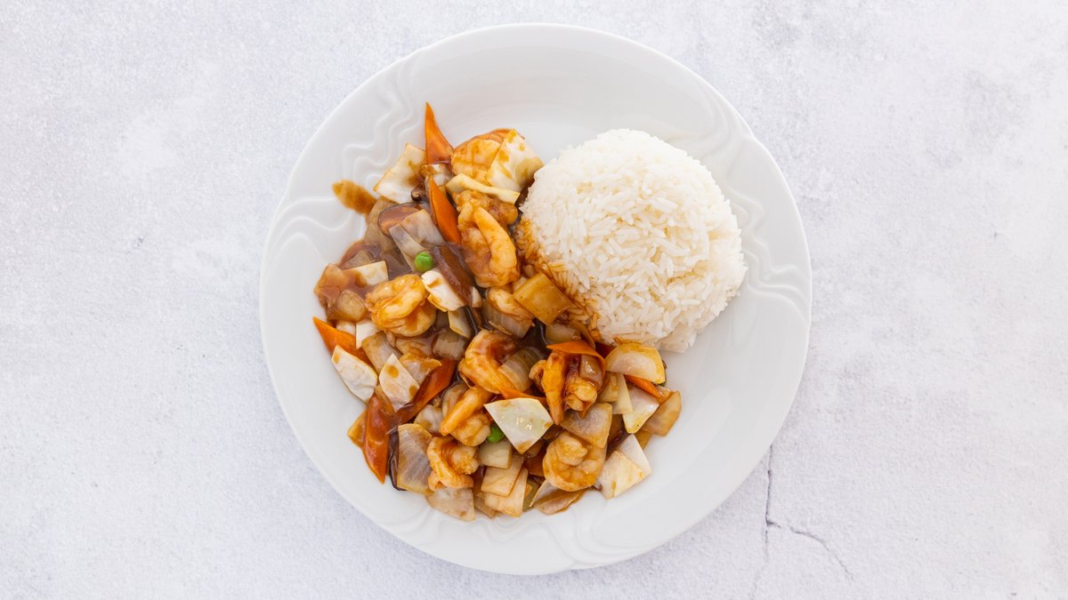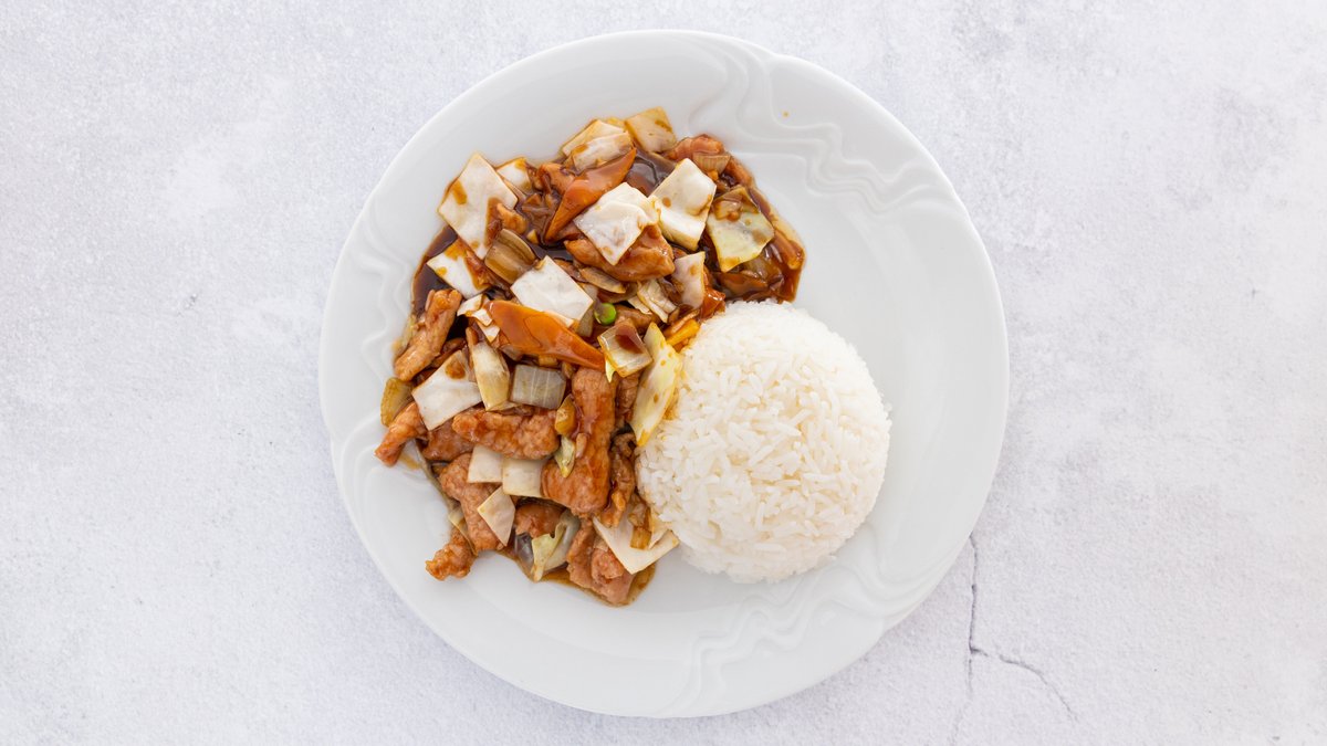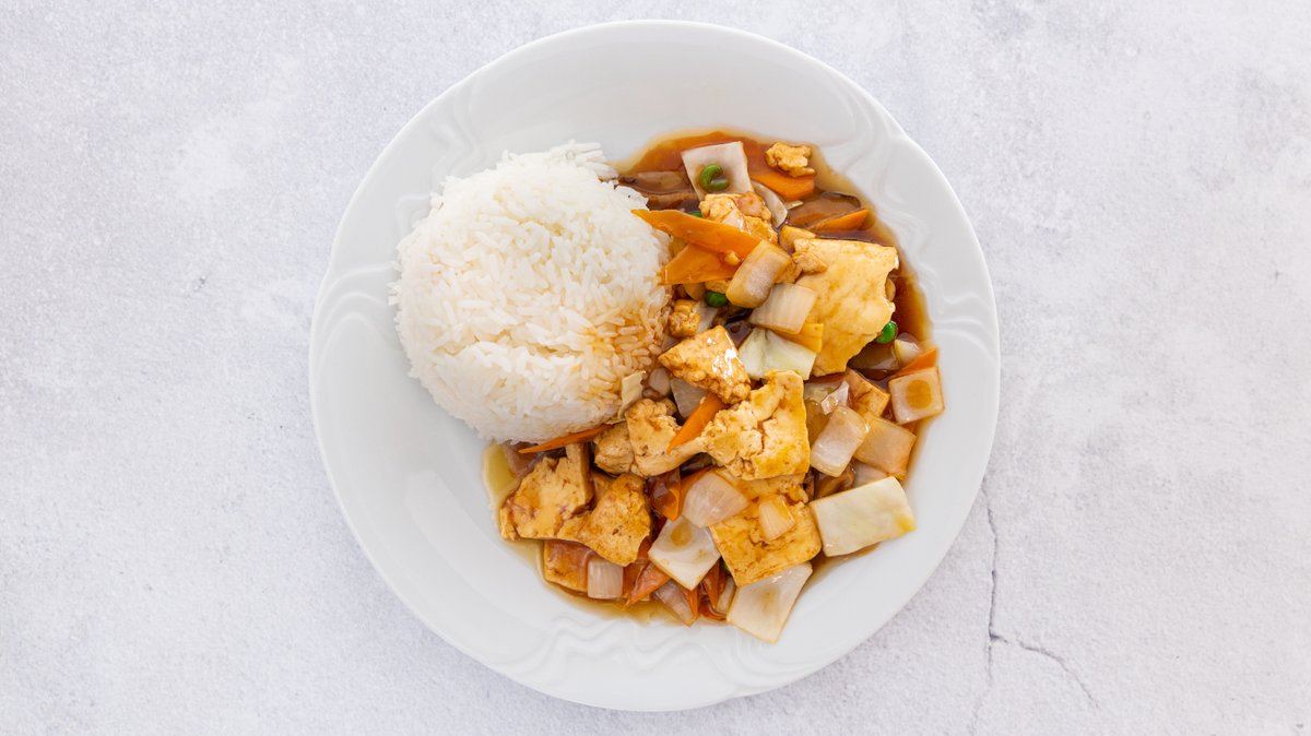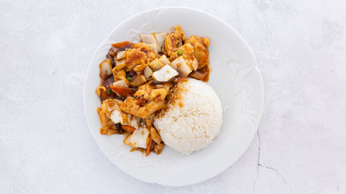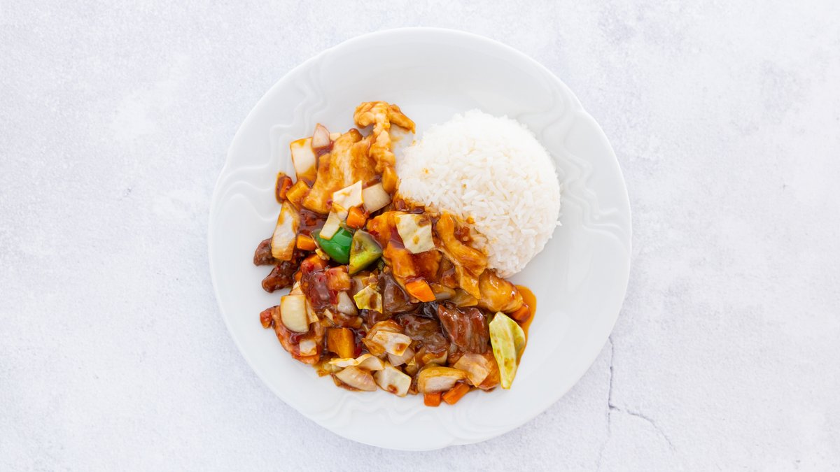 kuře ve sladkokyselé omáčce , čínský salát , pikantní polévka , bílá rýže