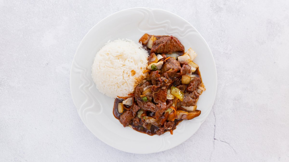 hovězí po sečuánsku , čínský salát , pikantní polévka , bílá rýže