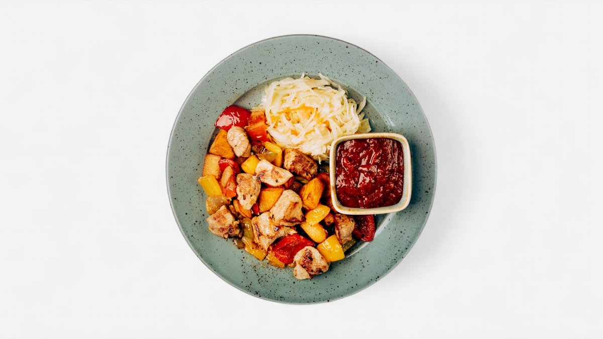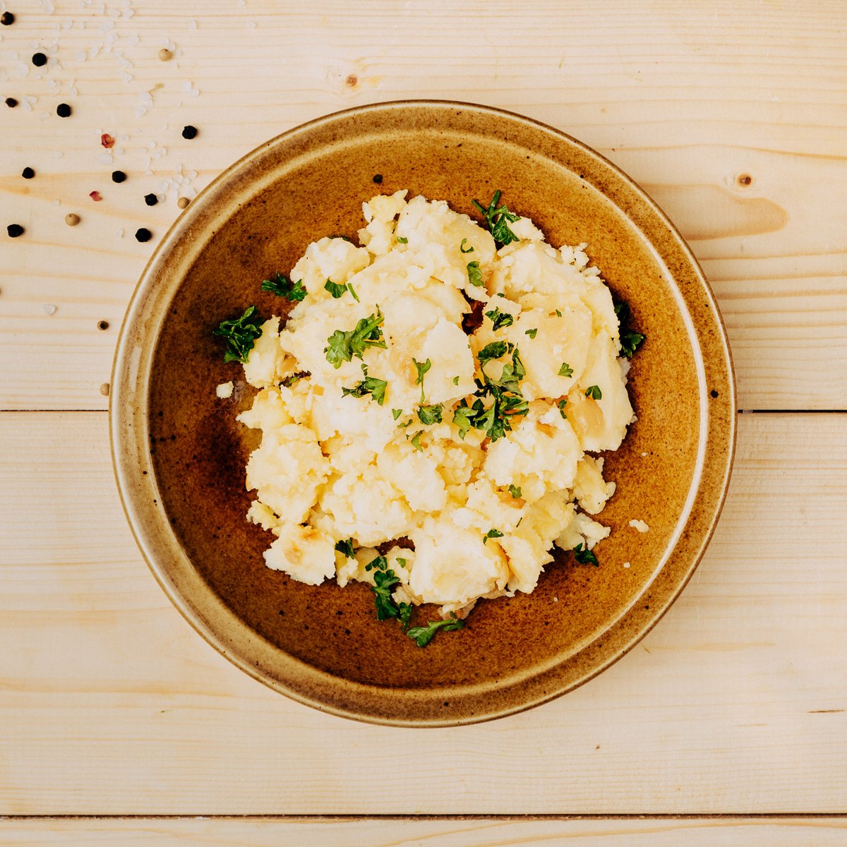 Vařený brambory, vejce, čerstvá okurka, kuřecí maso, červena cibule, majoněza, bramborově domácí čípsy , kopr, sul, pepř