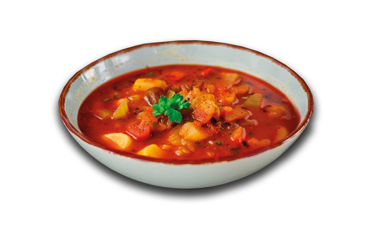 Koleno, vepřové maso, uzené klobásy, žebra, brambory, rajčata, čerstvá paprika, mrkev, vejce, kořeny, sůl, pepř