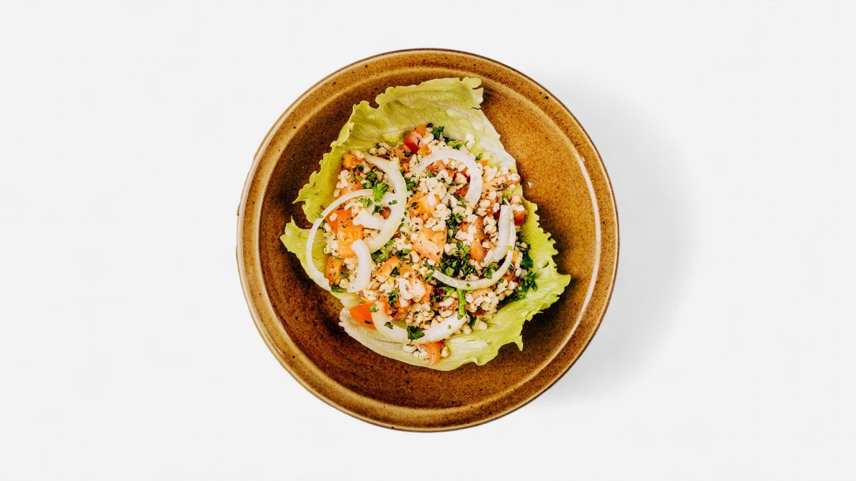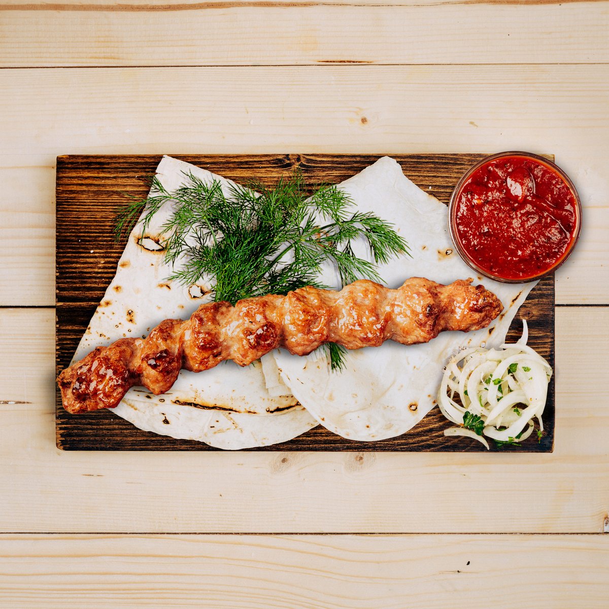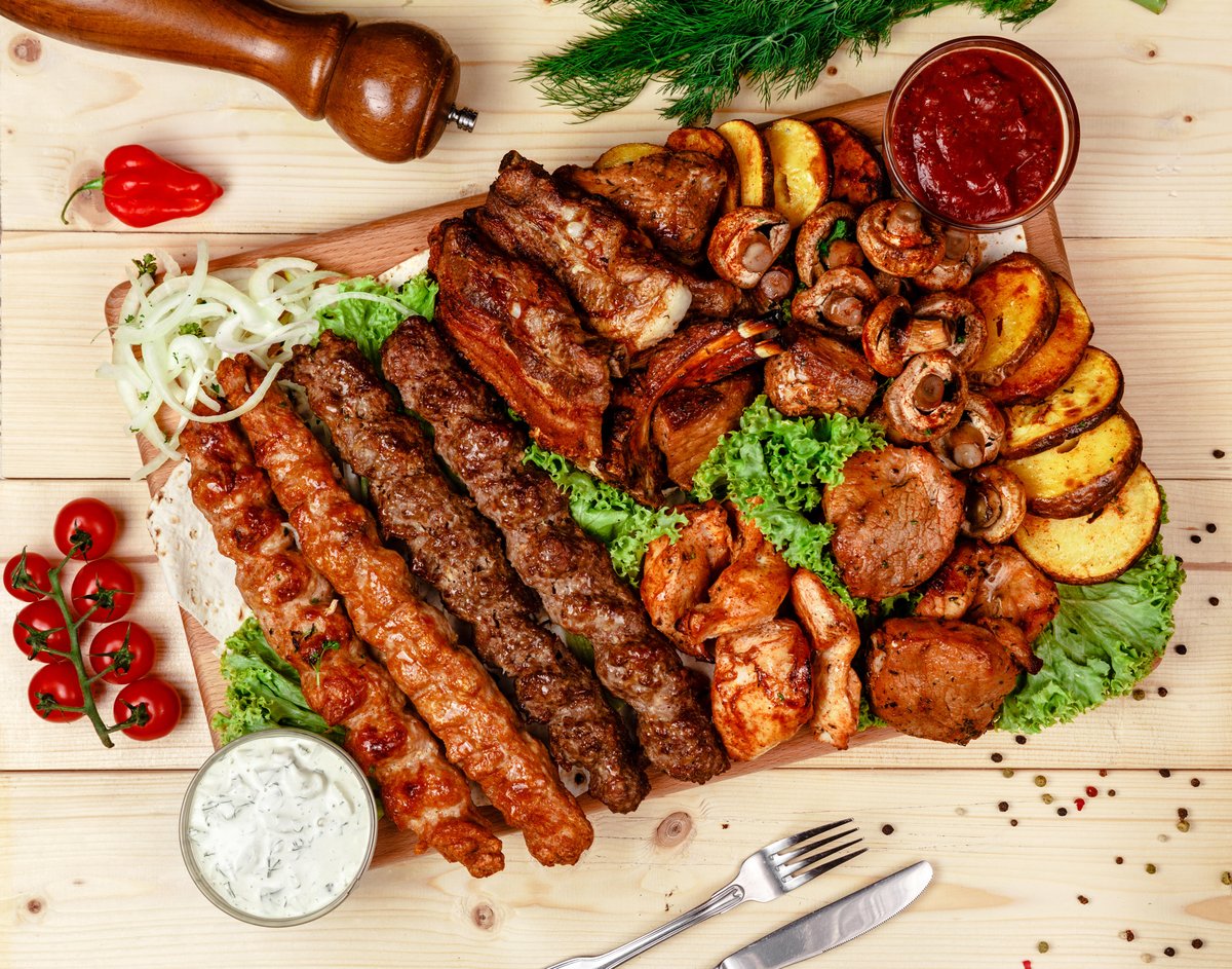 Babylon - mleté maso na jehle grilováné na uhlí. Hmotnost: +-150 g. + příloha na výběr 200g + salát + omáčka
