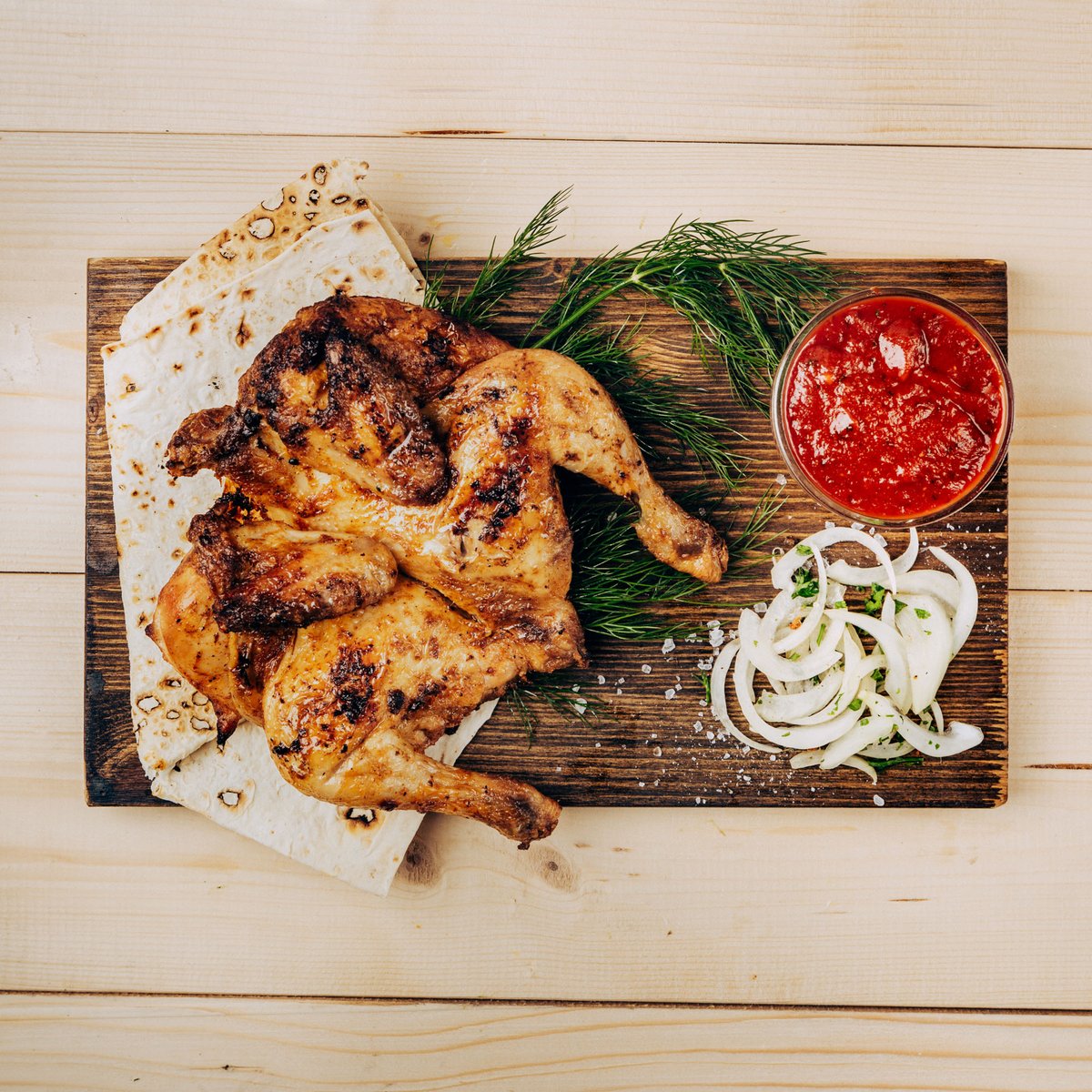 grilované baby kuřátko na uhlí s lavašem + omáčka 500g