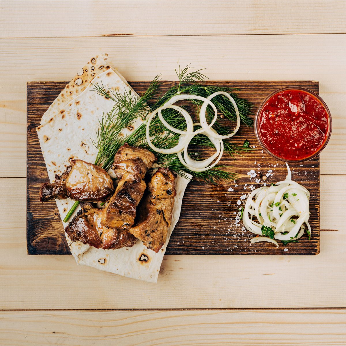 Grilované maso na uhlí + lavaš (chlebová placka) + omáčka(50g)