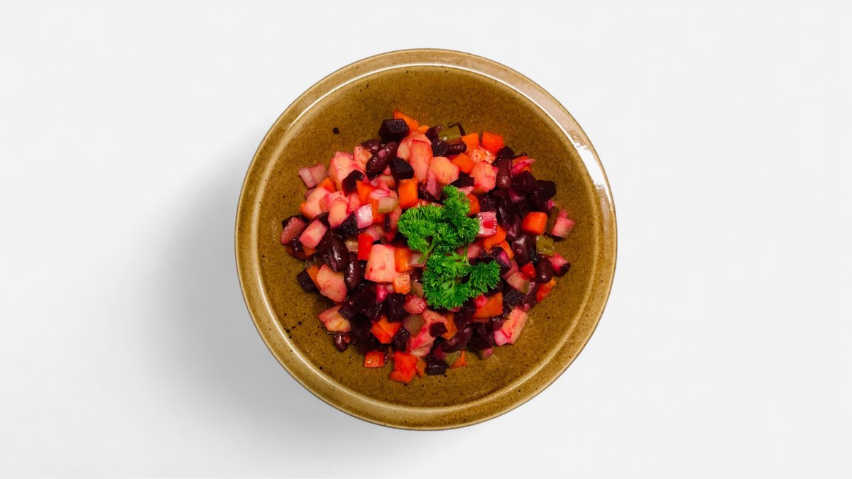 je směsí uvařených fazolí, brambor, červené řepy, slané okurky, mrkve, cibule, olej.