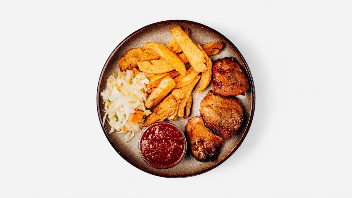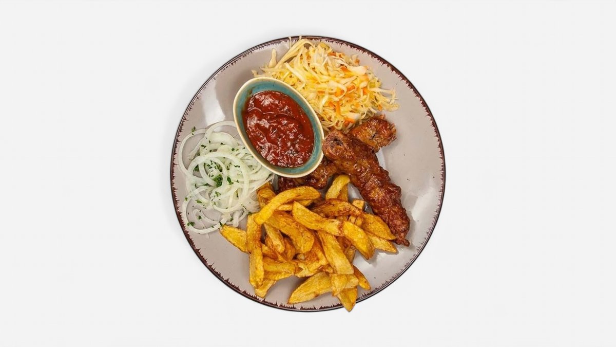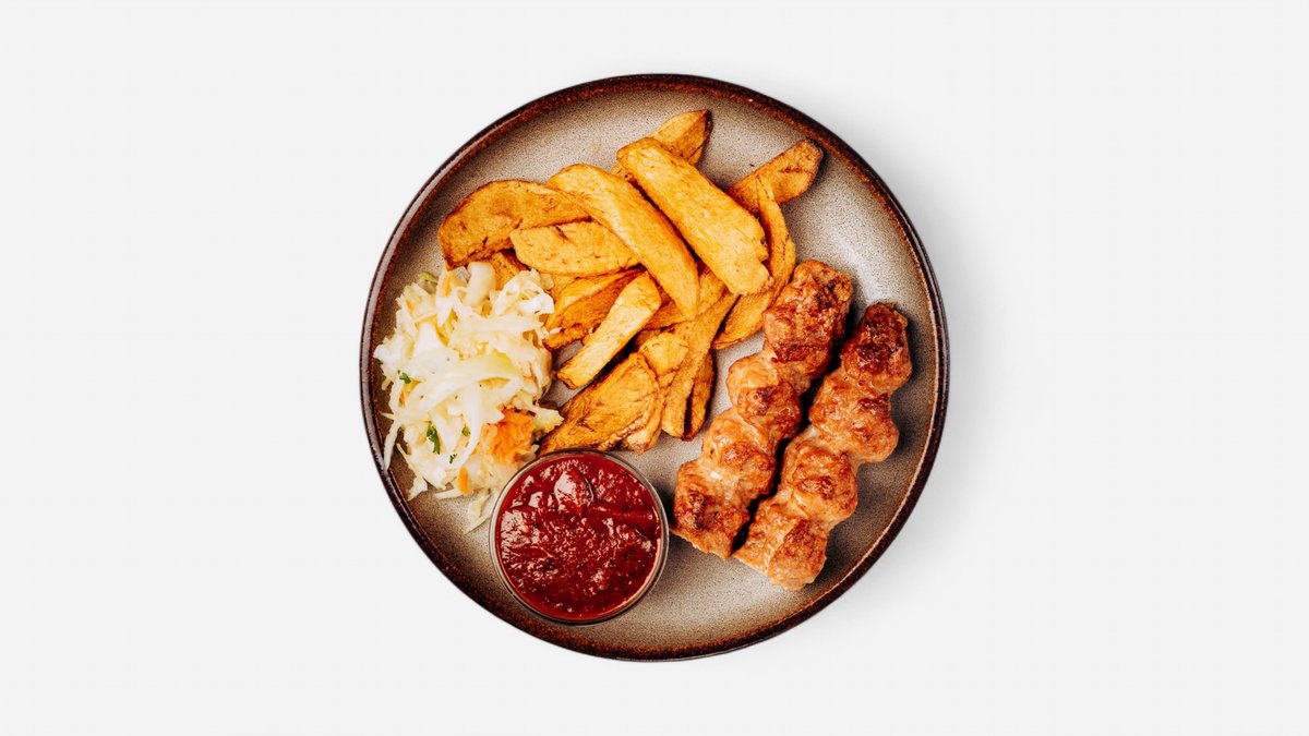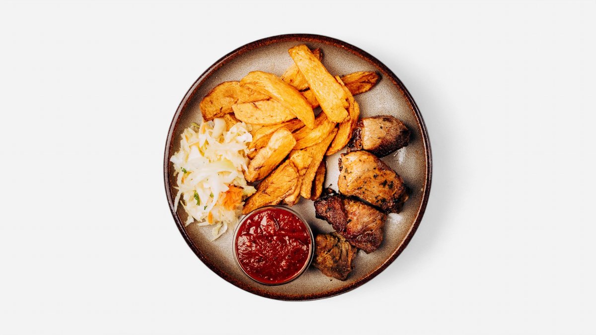 Šašlik - kousky masa na jehle grilováné na uhlí. Hmotnost: +-150 g. + příloha na výběr 200g + salát + omáčka