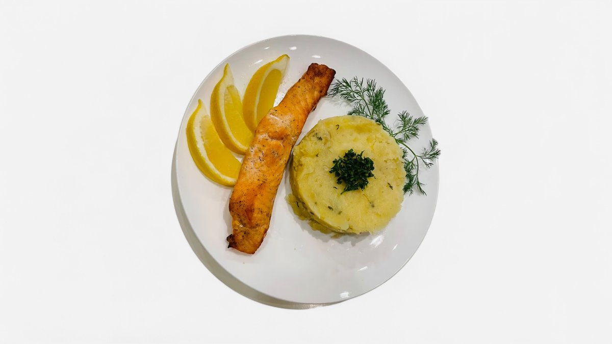 Grilovaný losos - grilováné na uhlí. Hmotnost: +-150 g. + příloha na výběr 150g + salát + omáčka