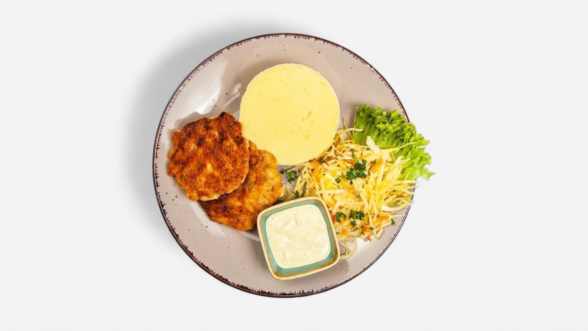 domácí smažené karbanátky z mletého masa a přílohou dle výběru + salát a omáčka 350g