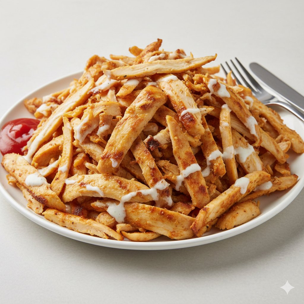 hranolky / rýže / pita chleba, maso zelenina, sýr omáčka