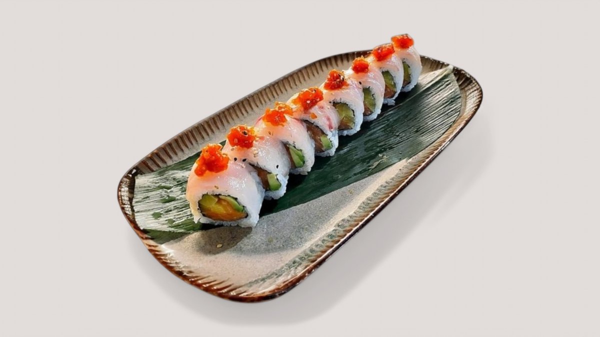 - INSIDE: salmon, avocado, philadelphia cheese - OUTSIDE/ COVERED: avocado, creamy butterfish with caviar, Passion Fruit-Coconut milk sauce 8 pieces