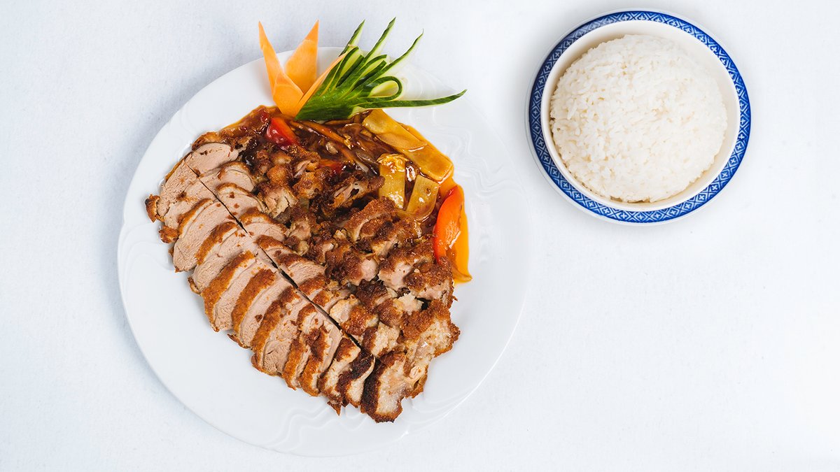 W25. Vepřové nudličky s porkem v pekingské pmáčce s rýži