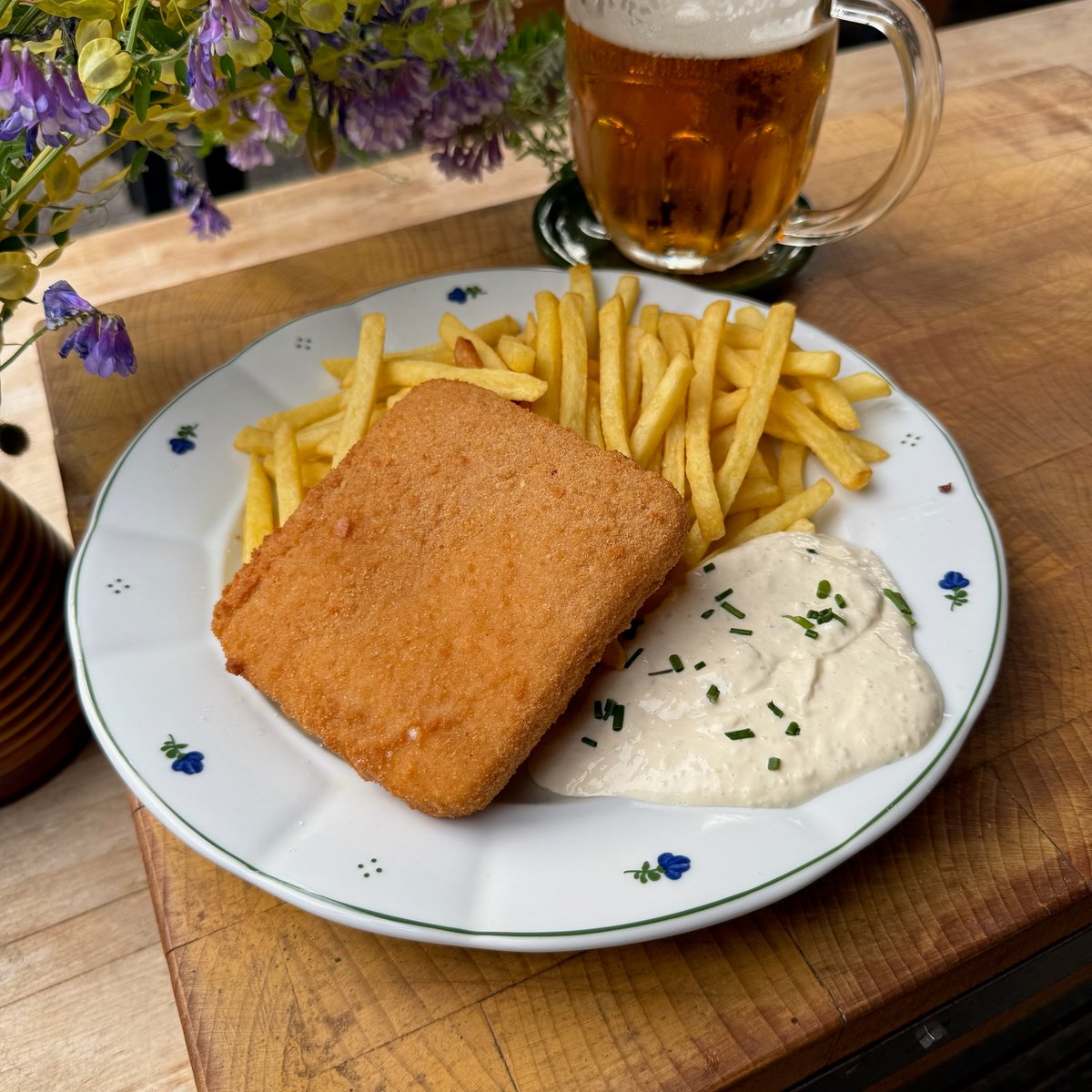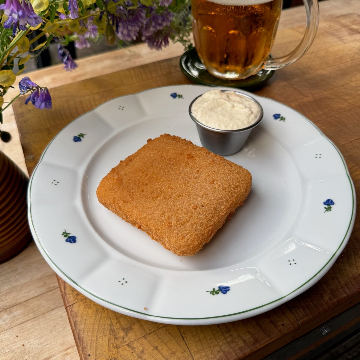 Smažený sýr (gouda), tatarská omáčka, krokety