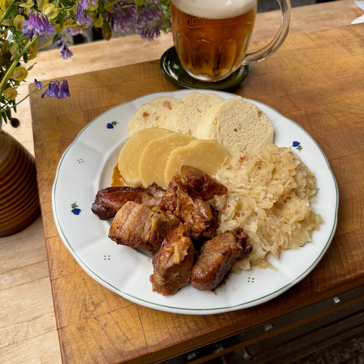 Staročeský talíř (uzená plec, vepřová pečeně, klobása, zelí), variace knedlíků