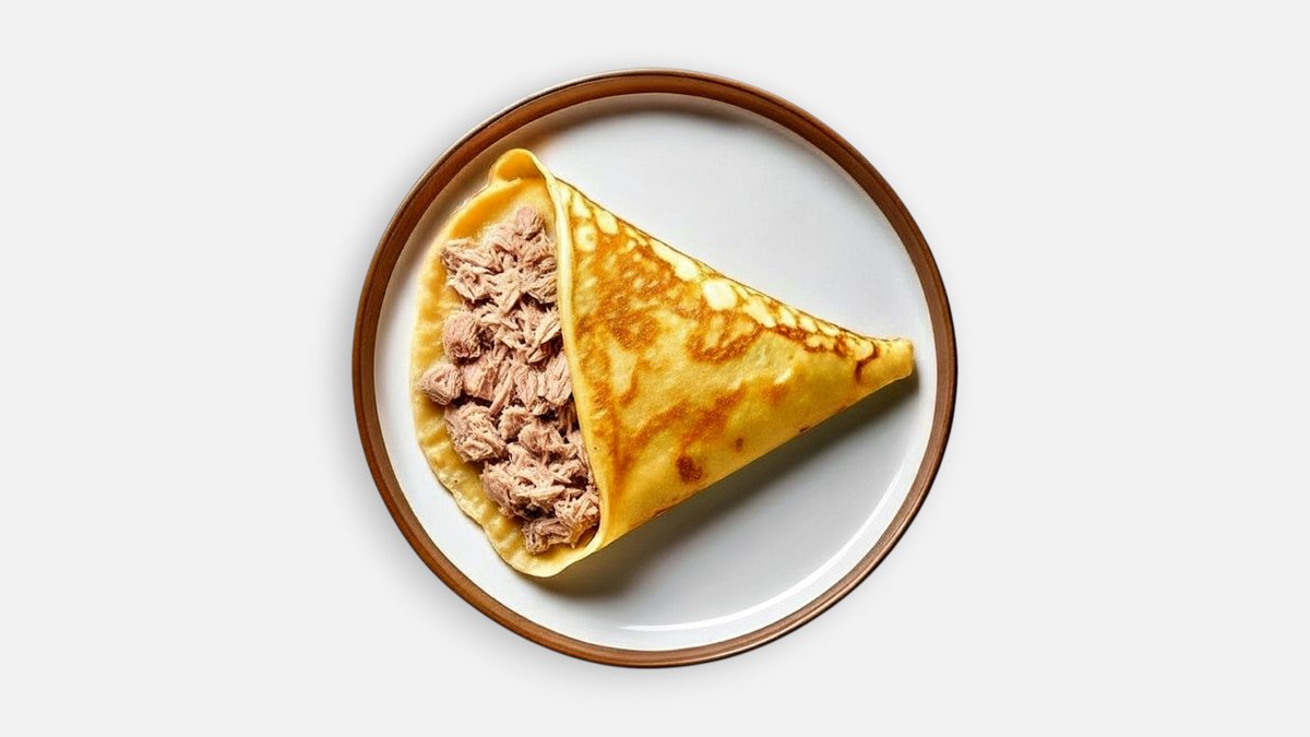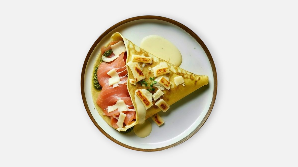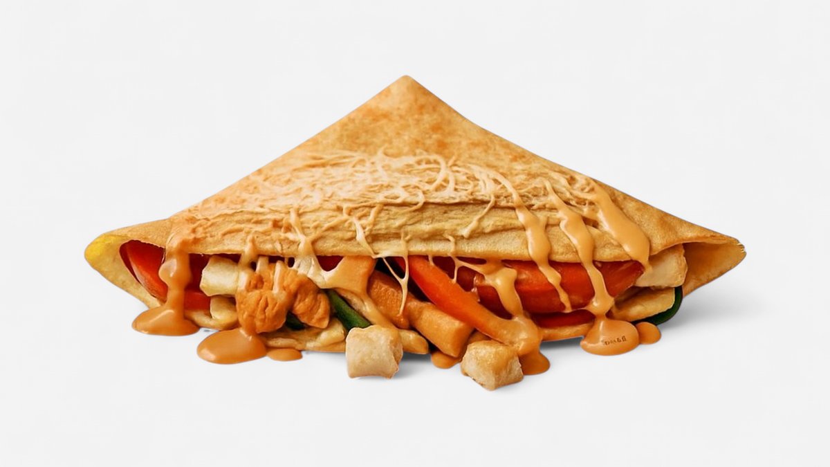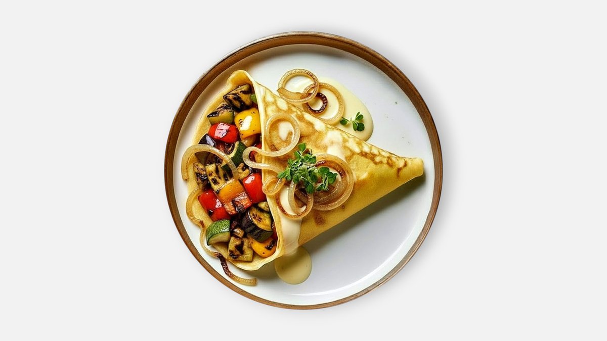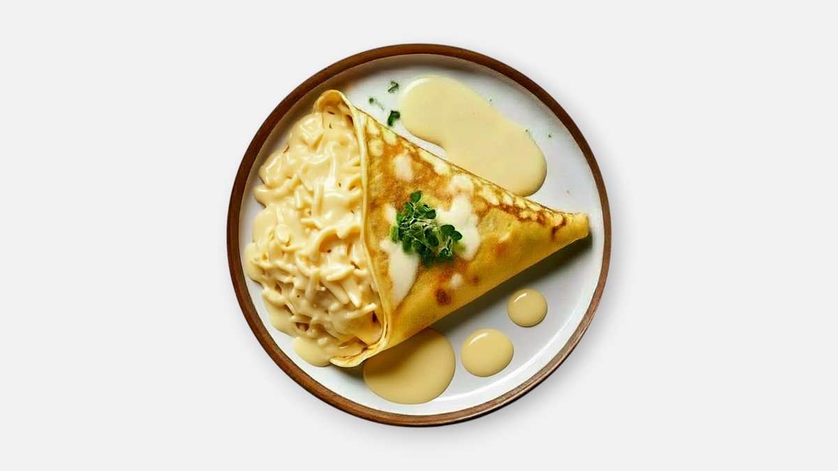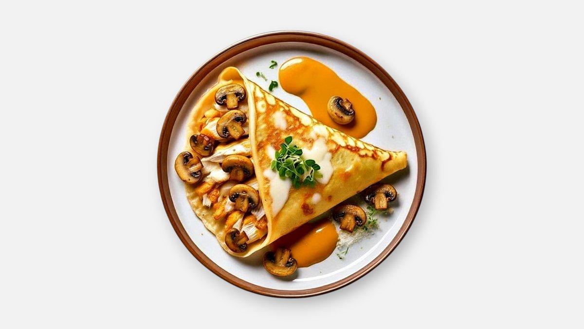 A crêpe filled with chicken, mushrooms, potatoes, mozzarella, grilled vegetables, and cheese sauce.