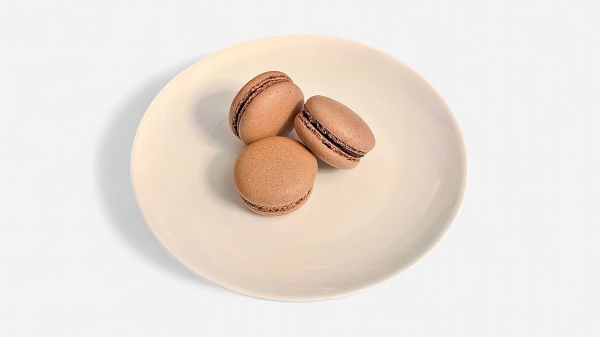 Křehká makronka z mandlové mouky, bílků a cukru spojená ganáží z hořké čokolády.