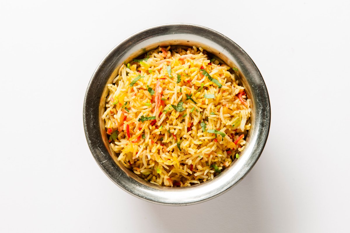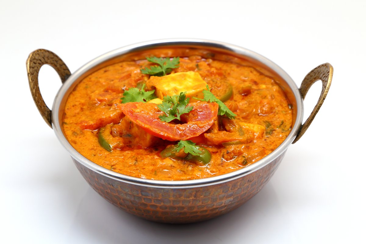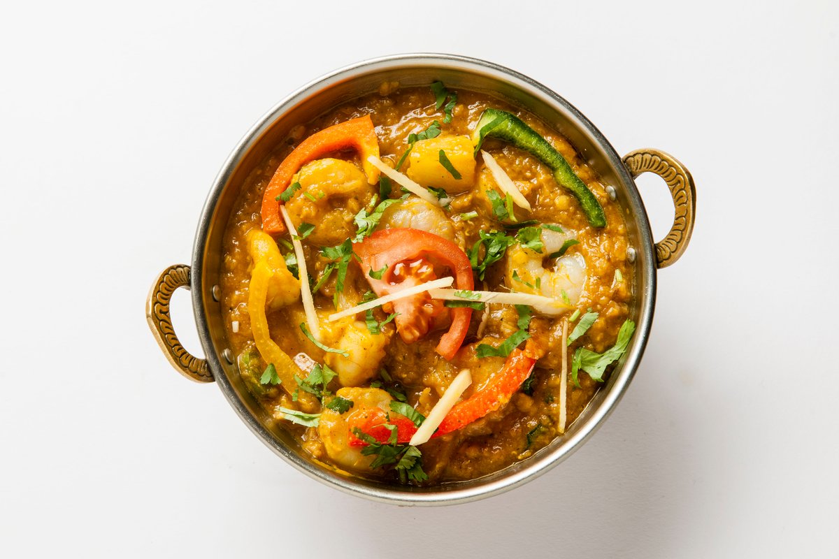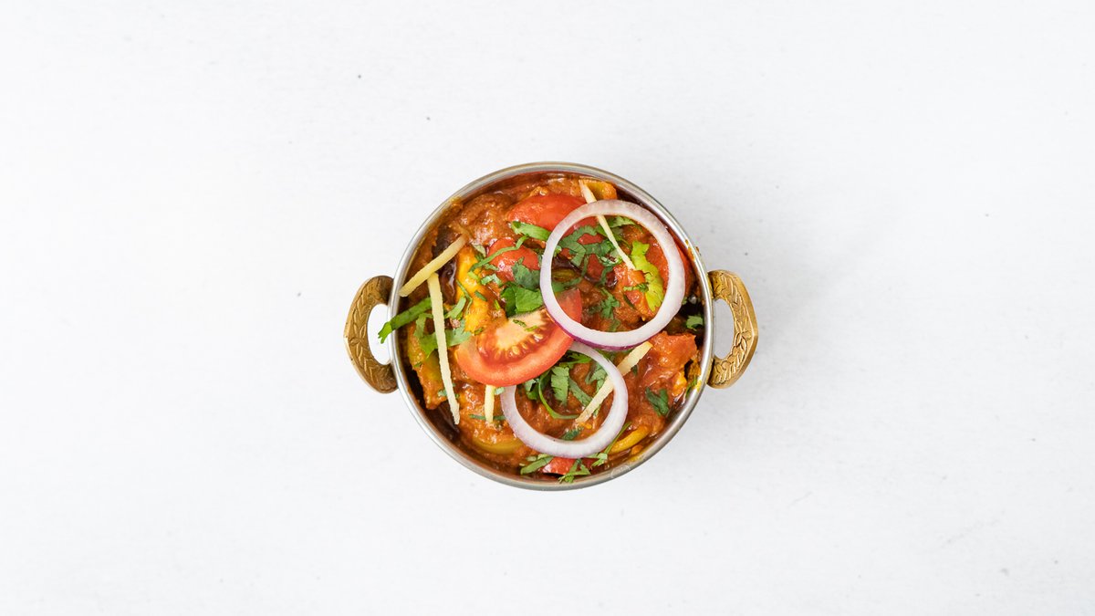 velmi ostrý pokrm připravený s chili, bramborem a indickým kořením