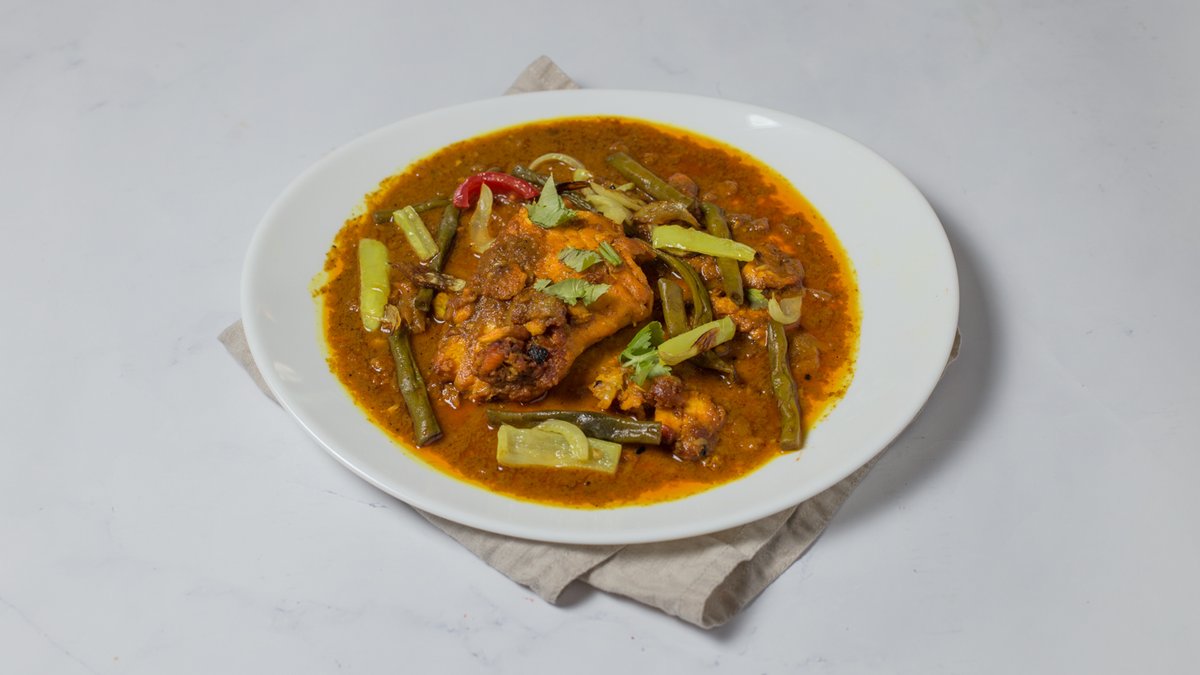 velmi ostrá omáčka s kousky masa, s cibulí zázvorem, rajčaty paprikou a chili