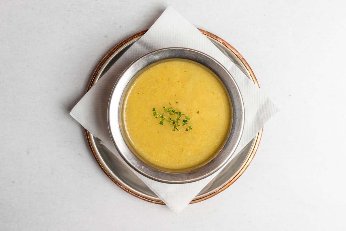polévka z červené čočky s cibulí, česnekem a citronovou šťávou