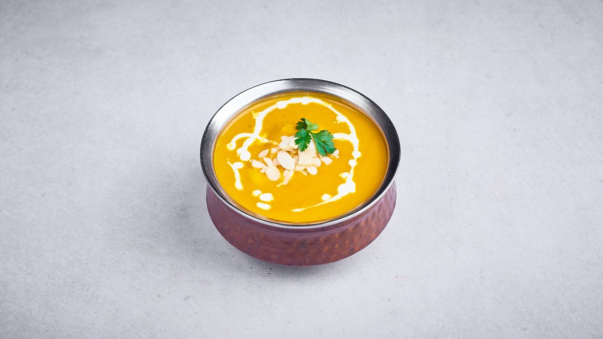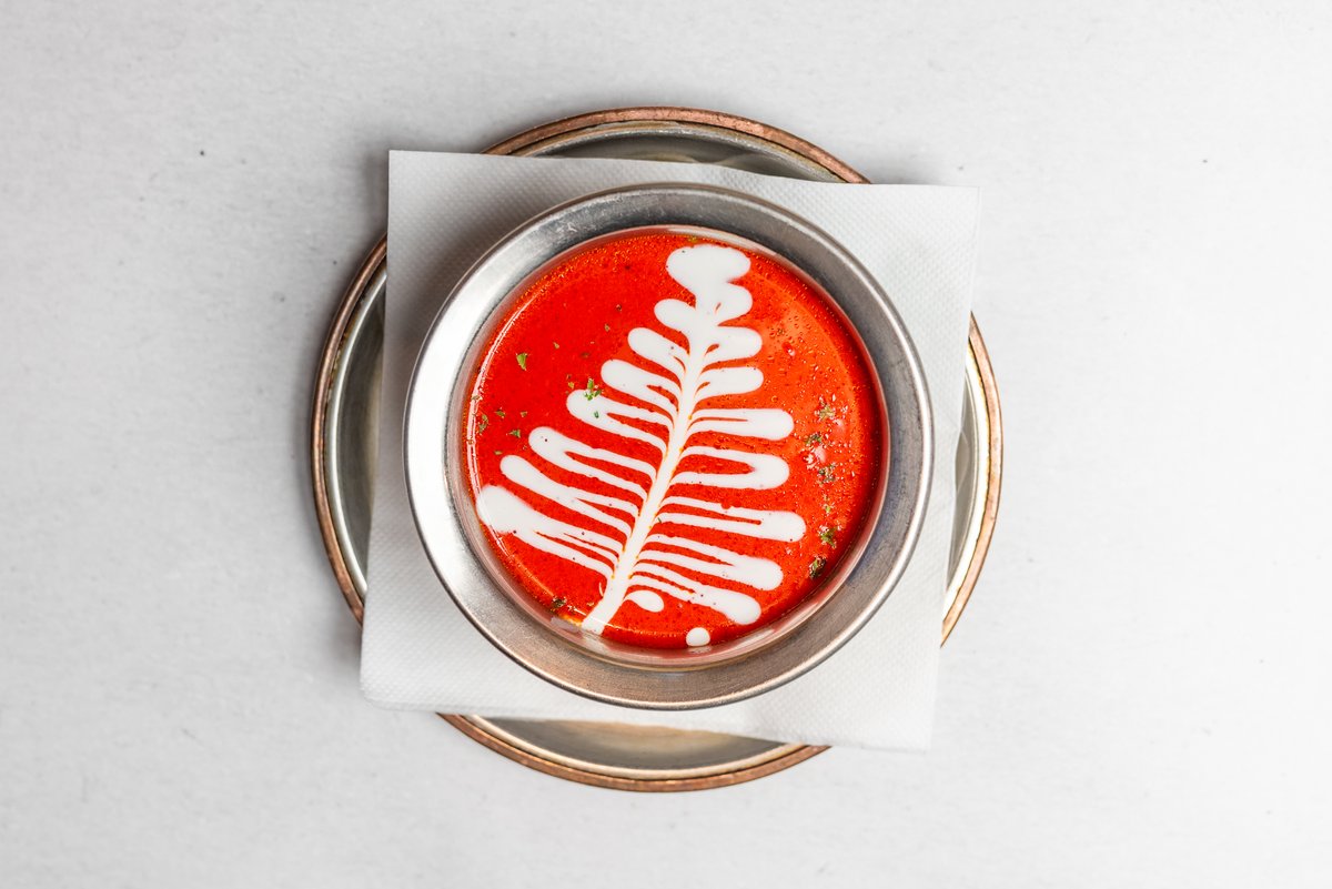 lehká rajčatová polévka, ochucená čerstvým koriandrem s indickým kořením