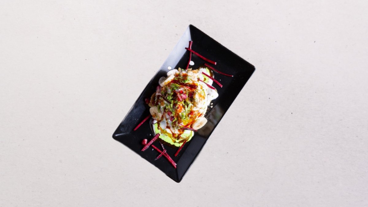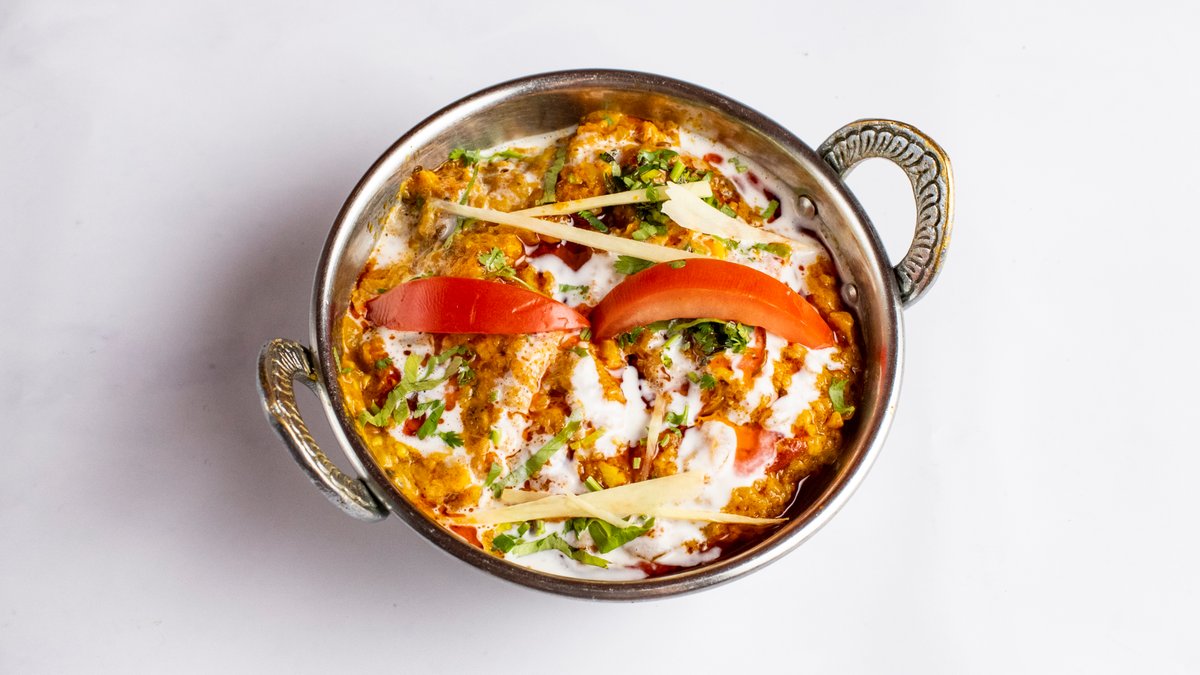 indická čočková koule, přelitá jogurtem, mátou a tamarindovým chutney