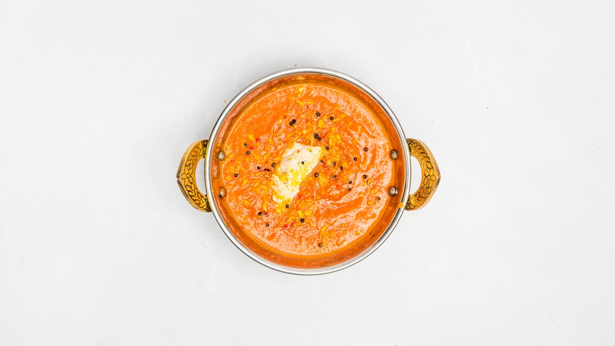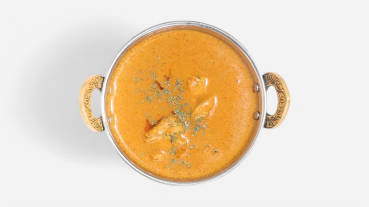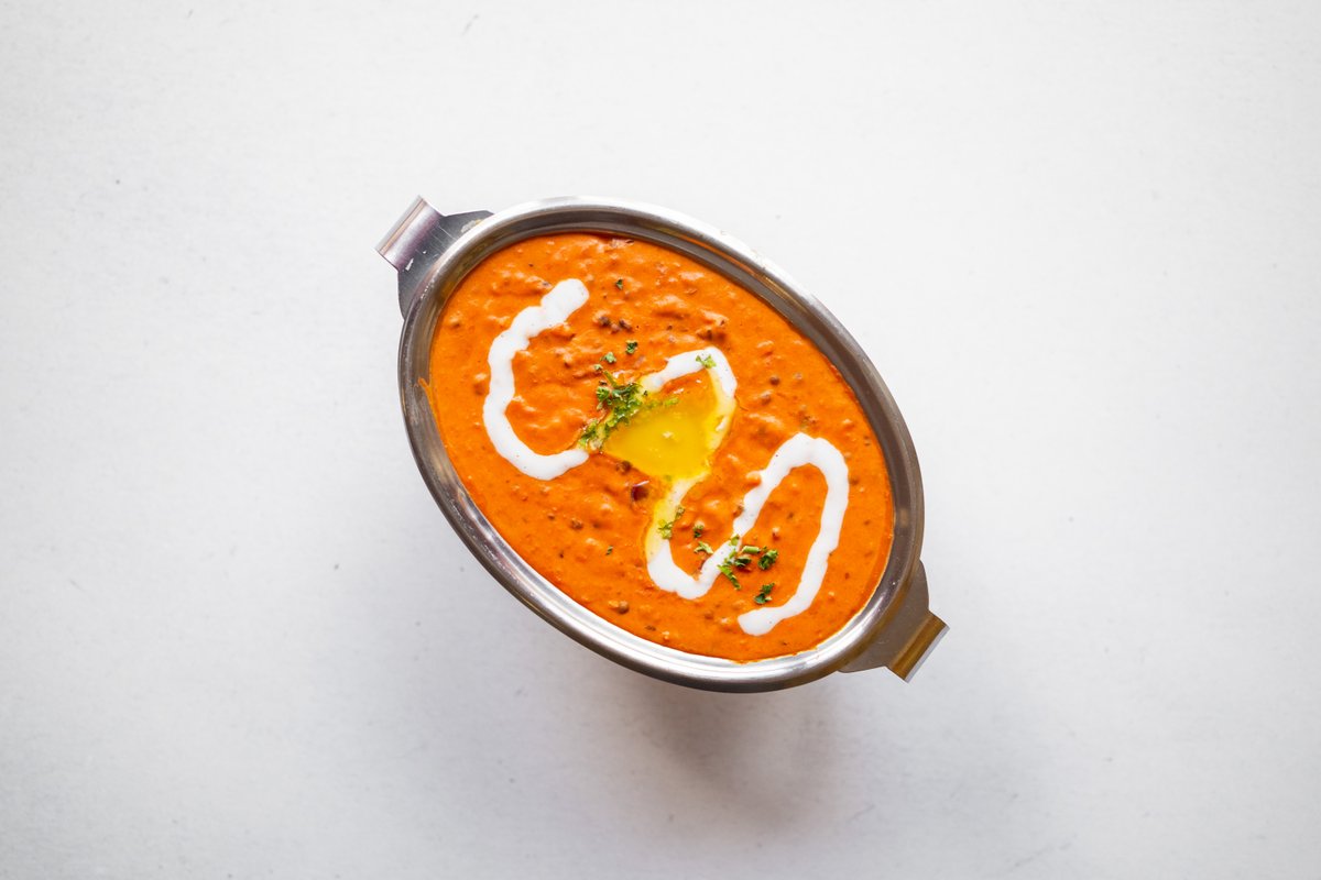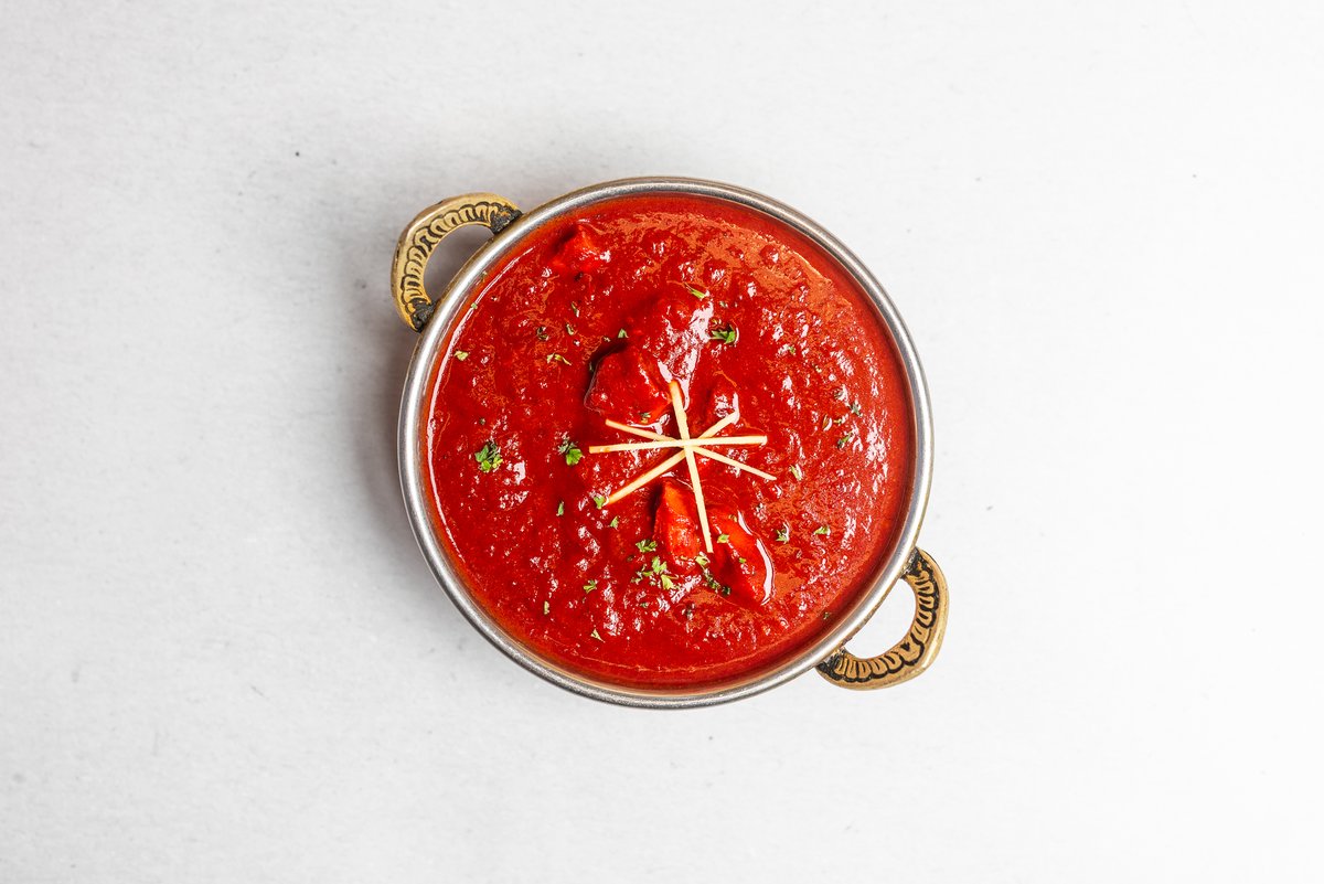 kuřecí tikka vařená v bohaté rajčatové omáčce, obohacená máslovou smetanou a aromatickým kořením