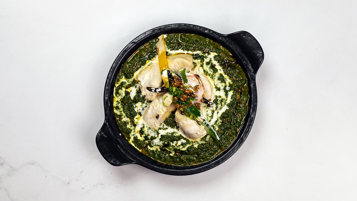 jemné jehněčí maso kořeněné zázvorem, česnekem a rajčaty vařené s čerstvým špenátem