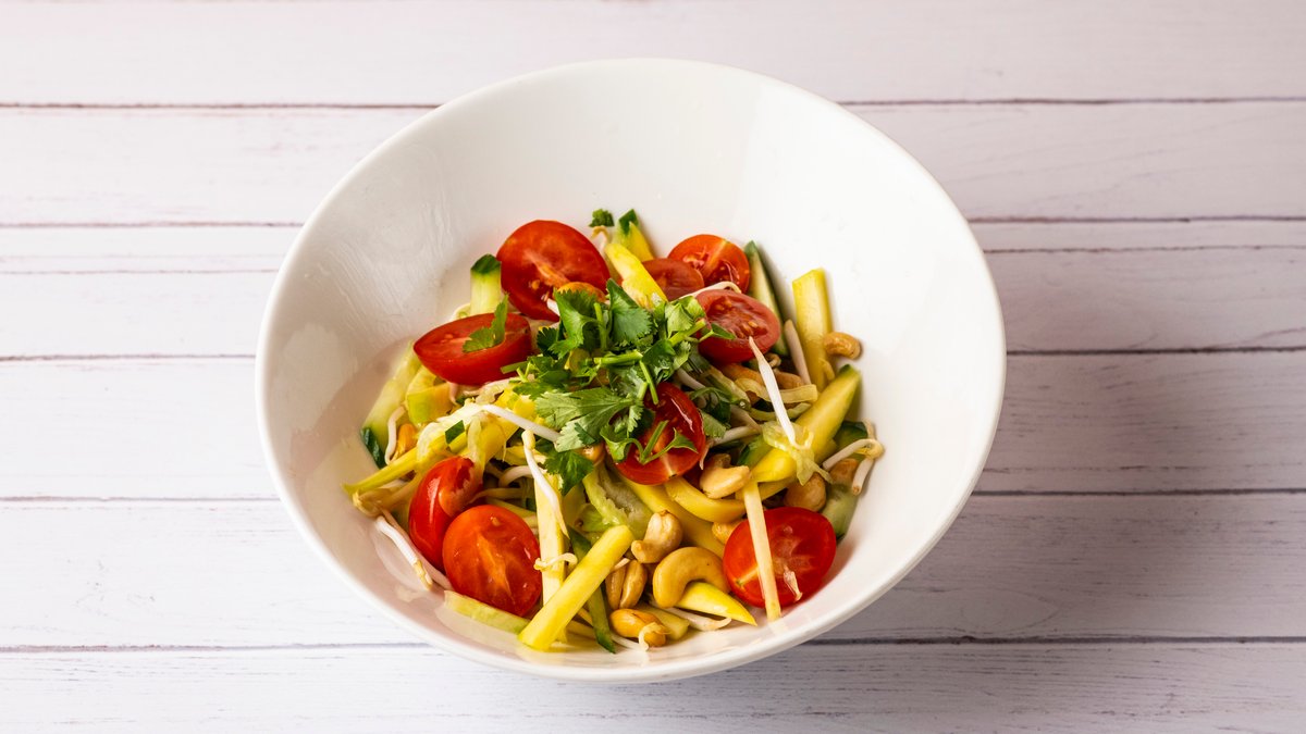 čerstvý mango salát se smaženou cibulí, paprikou a pikantním limetkovým dresinkem