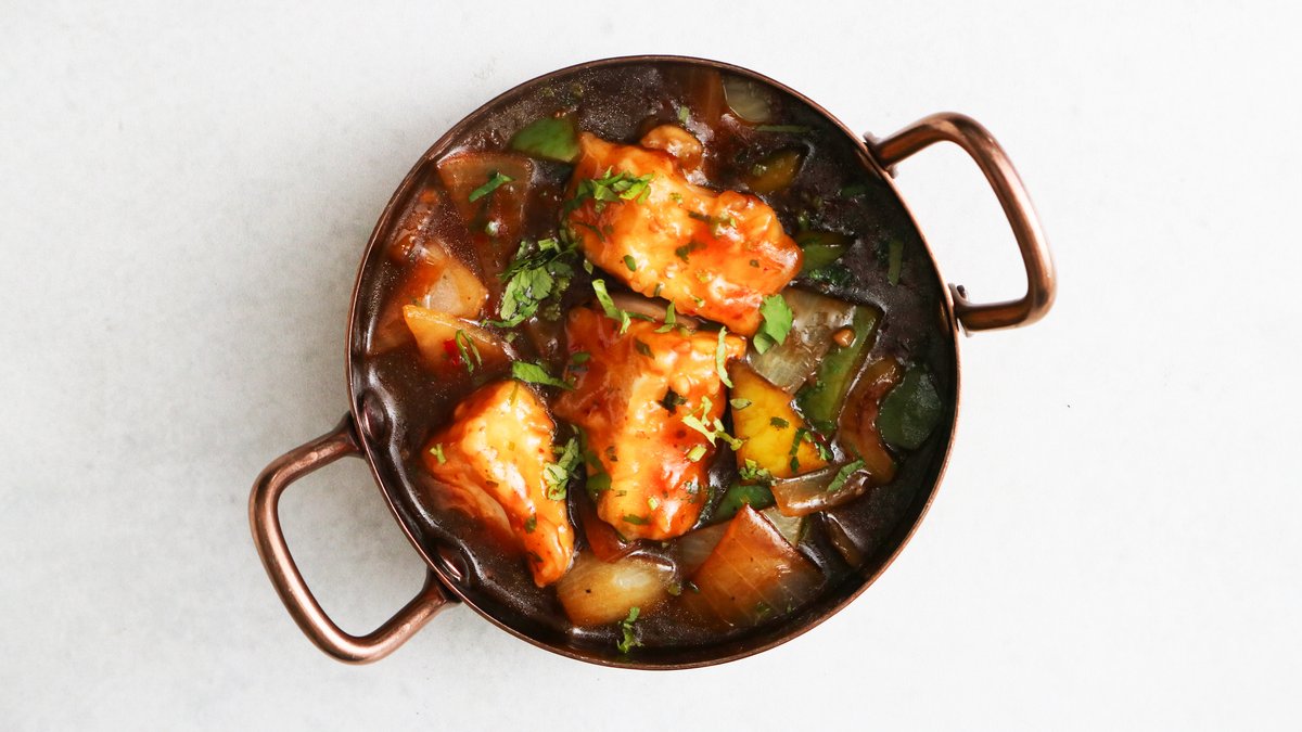 ryba vařená s jarní cibulkou, paprikovým kořením a pikantní sójovou chilli omáčkou