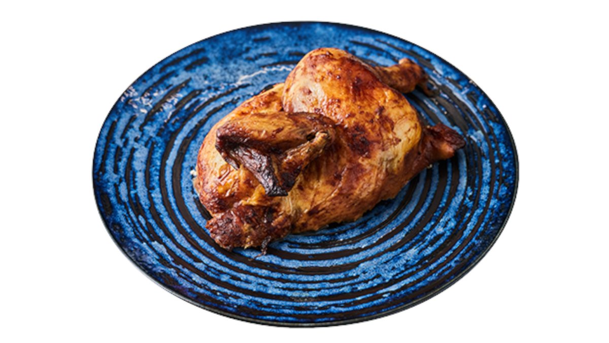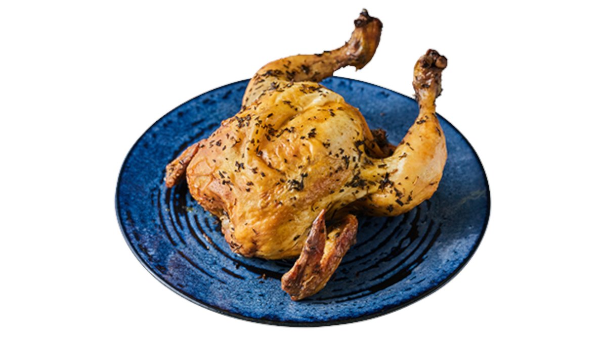 Grilované francouzské kukuřičné kuře, marinované ve směsi tymiánu, rozmarýnu a citronové šťávy.