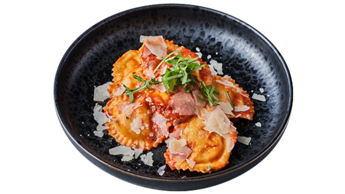 Vaječné těstoviny, plněné směsí s parmskou šunkou, doplněné o rajčatovou omáčku, parmazán a rukolu.