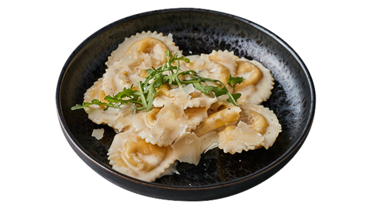 Vaječné těstoviny plněné dýní doplněné o parmazánovou omáčku, parmazán a rukolu.