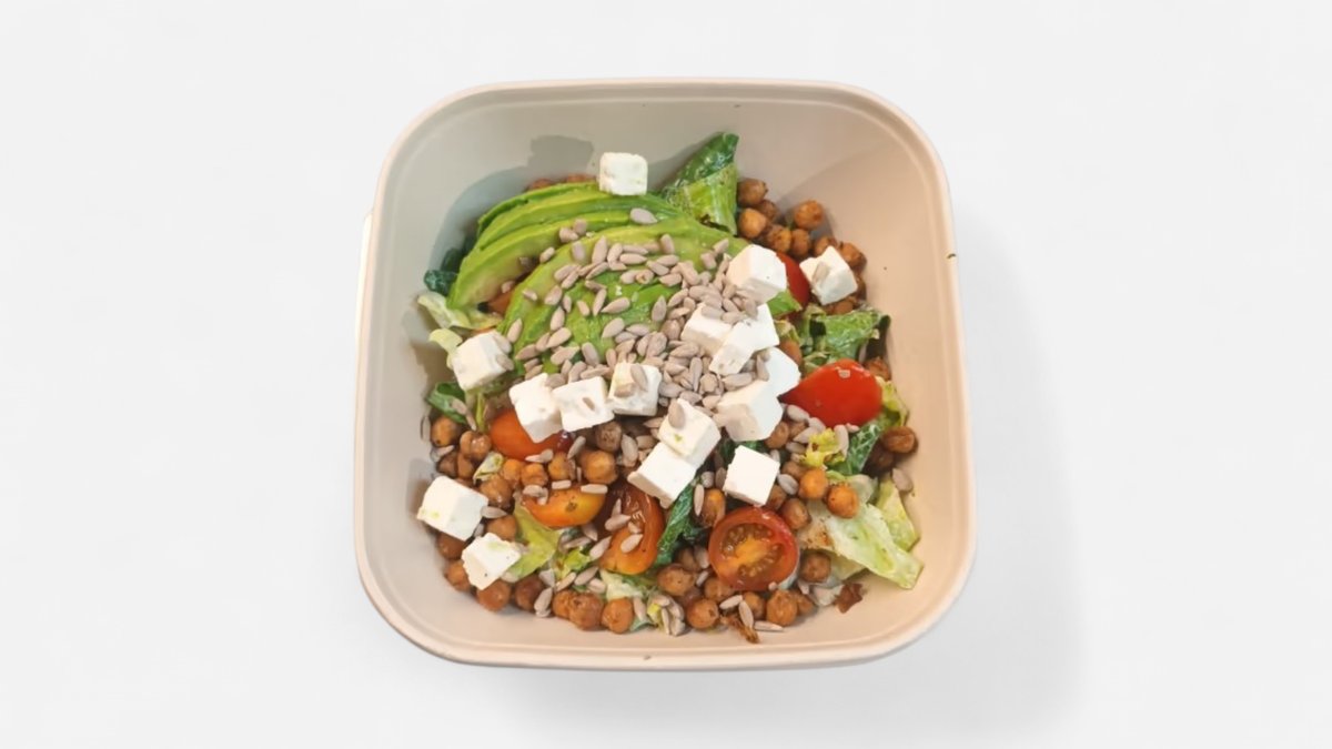Salát se sýrem feta a avokádem, doplněný o pečenou cizrnu, rajčata, slunečnicová semínka a mix salátů, zalité jogurtovým dressingem