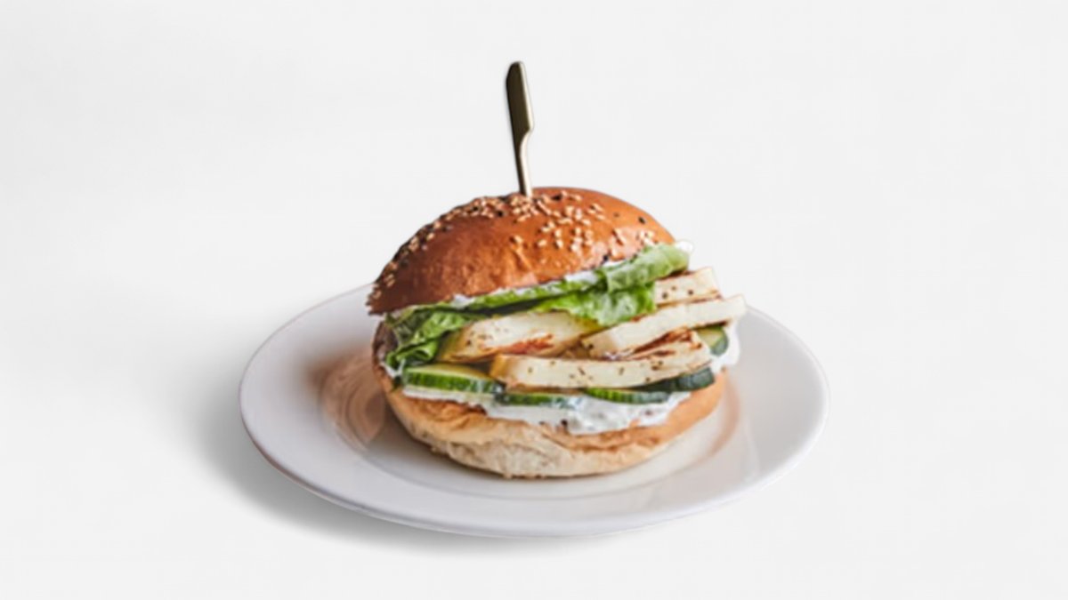 Sýr halloumi, salátová okurka, římský salát, tzatziki a hamburgerová bulka vlastní výroby.
