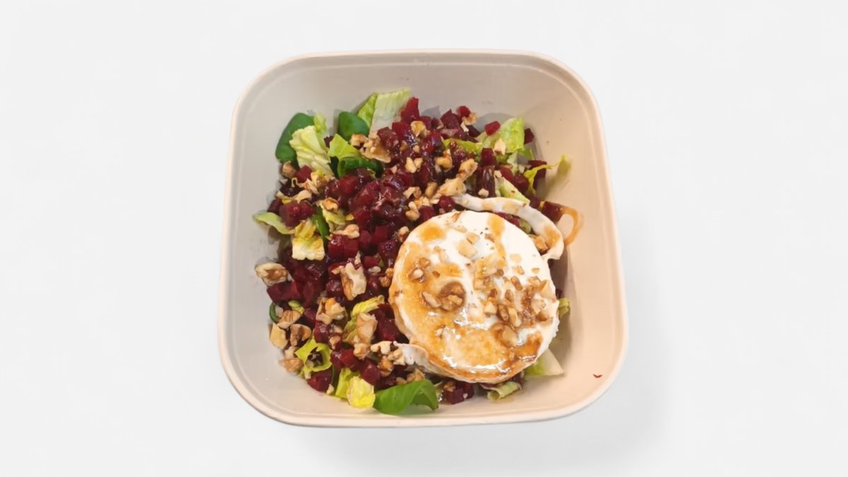 Grilovaný kozí sýr s červenou řepou, mixem salátů, vlašskými ořechy a balsamico dressingem.