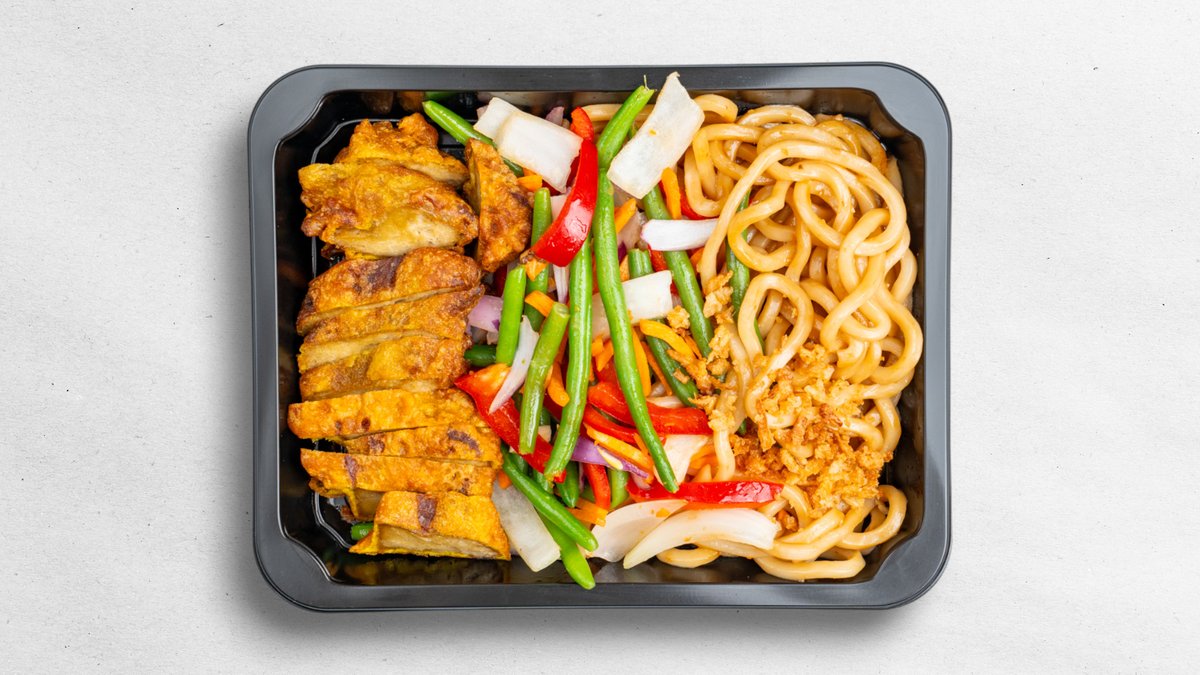 Nudle Udon s křehkou zeleninou skvěle ochuceno a veggie "kachnička" z domácího seitanu v pikantním těstíčku s originální zálivkou,oblíbené sójové kuličky ve šťavnaté aromatické omáčce , dobře ochuceno, jasmínová rýže, malý salátek se sladkokyselou zálivkou