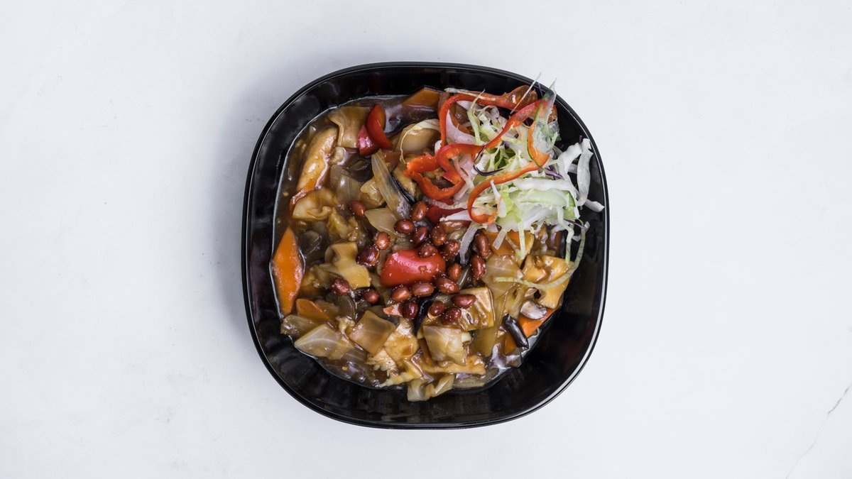 Seitan, barevná paprika, cibule, mrkev, houby portobello, bramborový škrob, česnek, arašídy, sladká sójová omáčka, slaná sójová omáčka, červené chilli, olej, sůl, hoisin omáčka (cukr, voda, sójové boby, pšeničná mouka, brambory, karamelová barva, kukuřičný škrob, sušený česnek, sezamová pasta, chilli paprička, kyselina octová)