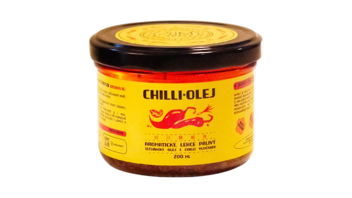 Náš domácí chilli olej, lehce pálivý a aromatický.