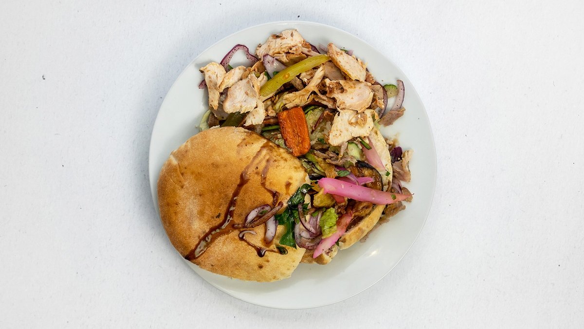 pita chléb, kuřecí, grilovaná zelenina (mrkev, cuketa, lilek), čerstvá zelenina (ledový salát, rajčata, okurky, červená cibule s bylinkami, kyselá okurka, tuřín omáčka z granátových jablek