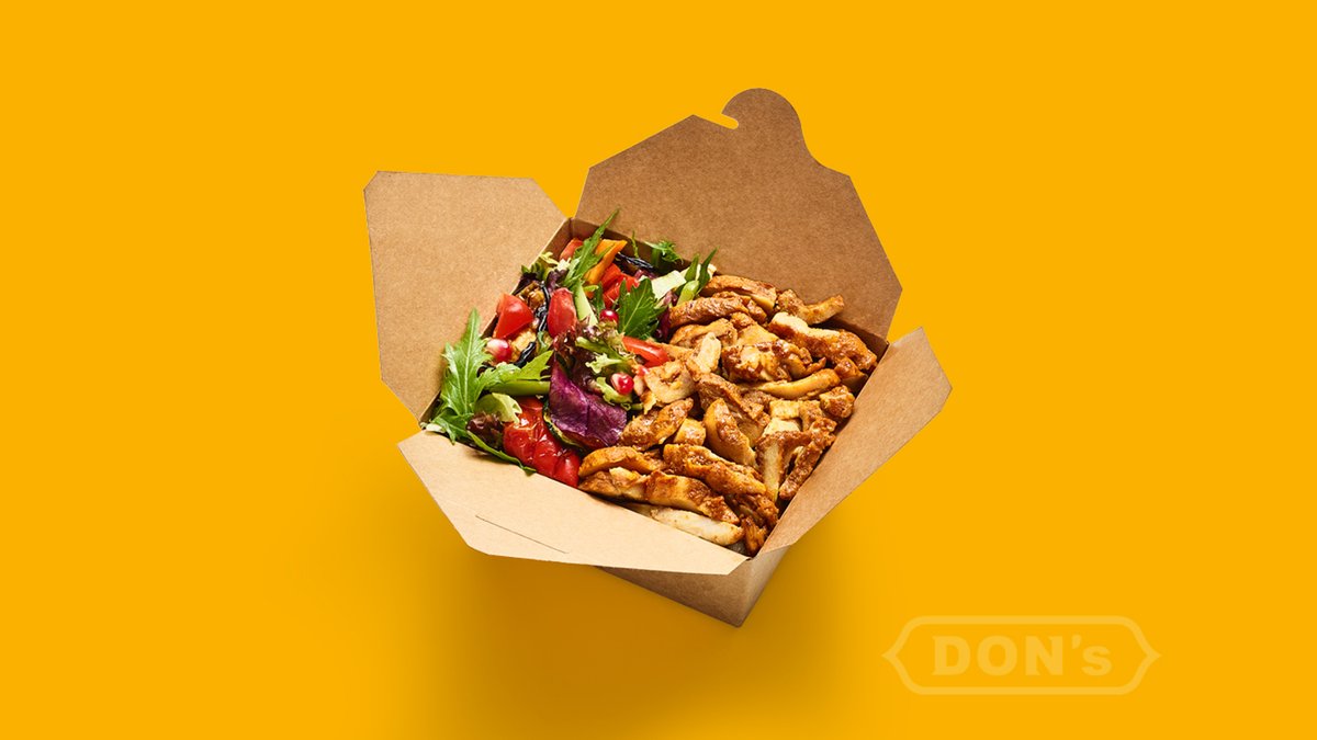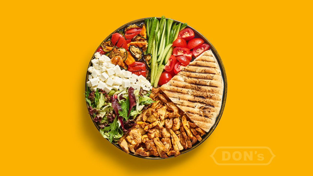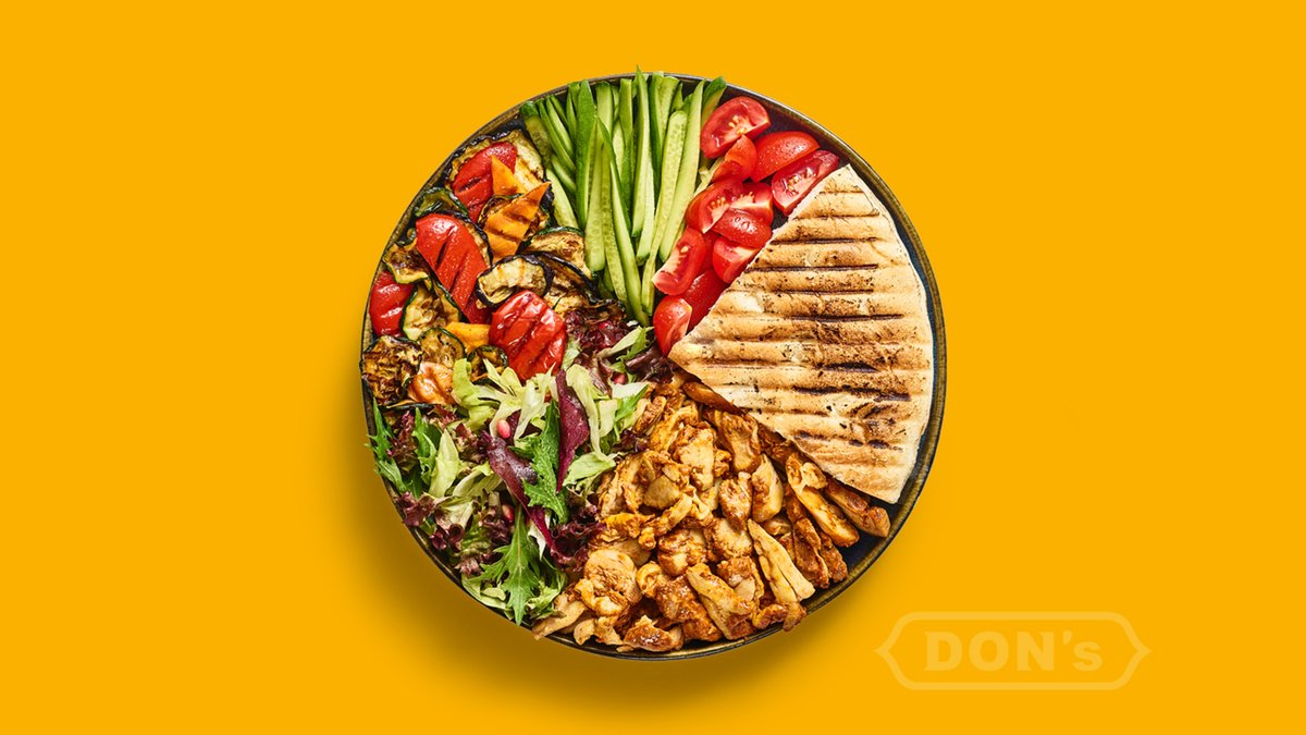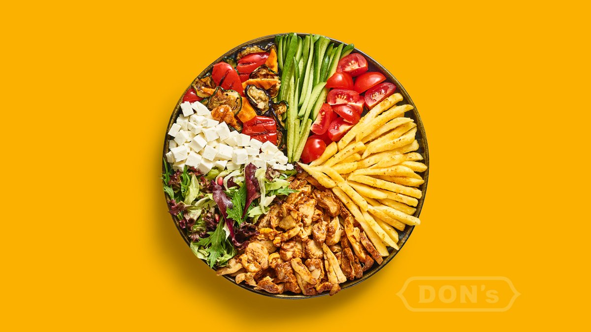 menší porce čerstvého kuřete, fritovaná zelenina (lilek, cuketa, paprika, mrkev, brambory), čerstvý salát, okurka, rajčata, jemný balkánský sýr, citronová šťáva, bylinky a koření, omáčka dle výběru