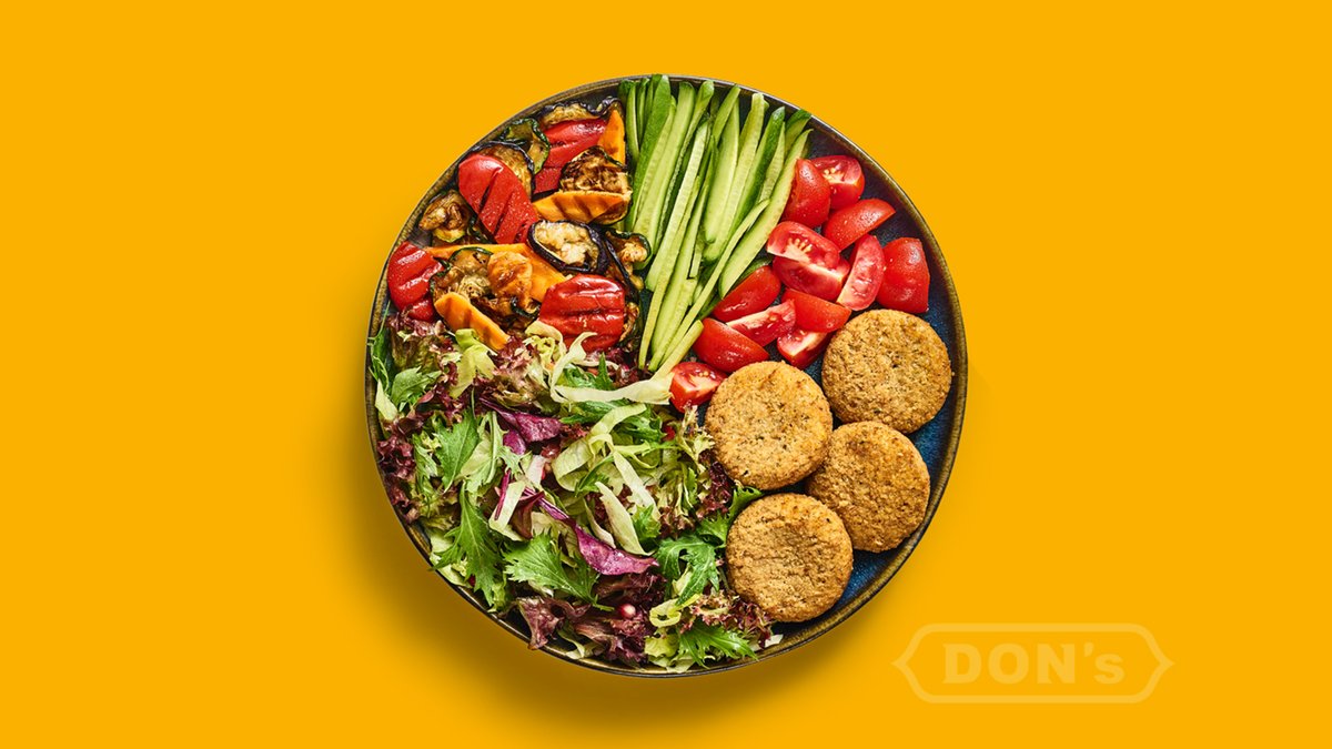 falafel, fritovaná zelenina (lilek, cuketa, paprika, mrkev, brambory), čerstvý salát, okurka, rajčata, citronová šťáva, bylinky a koření, omáčka dle výběru