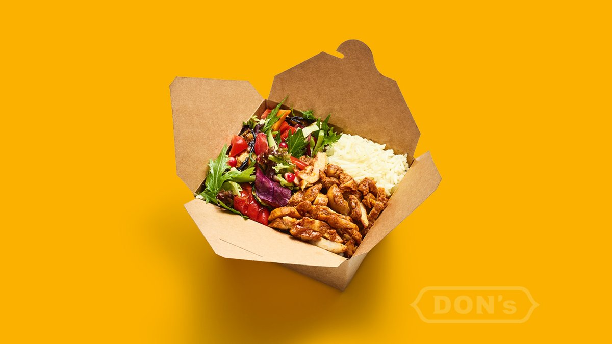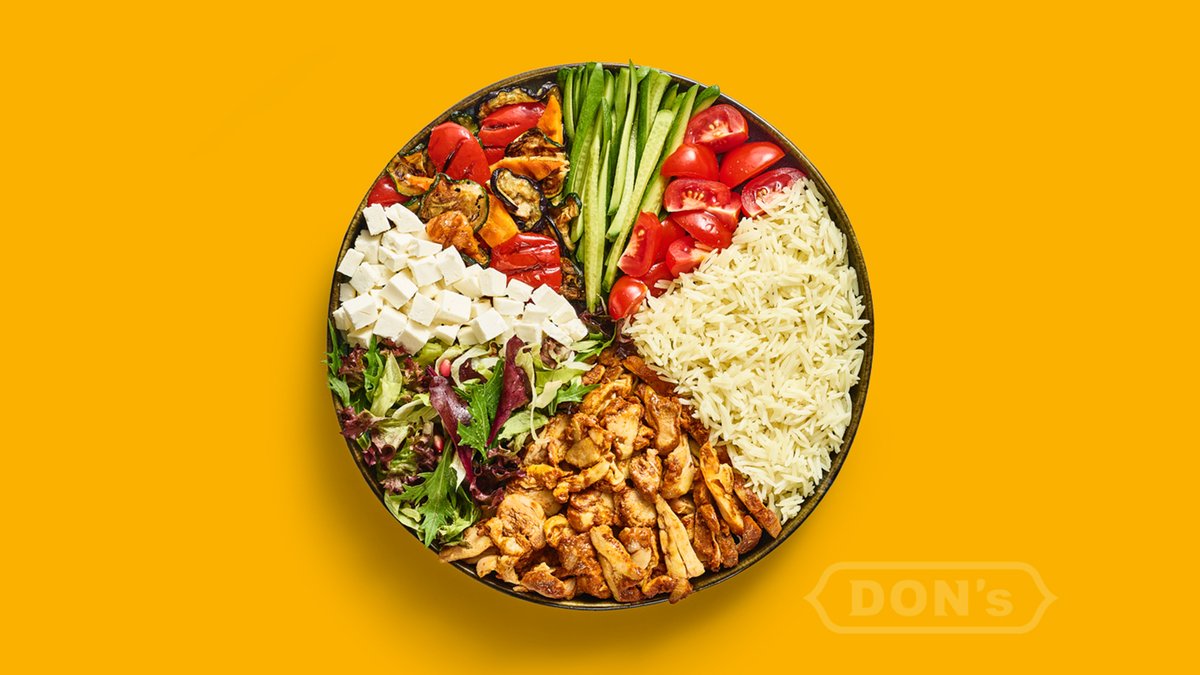 menší porce čerstvého kuřete, basmati rýže, fritovaná zelenina (lilek, cuketa, paprika, mrkev, brambory), čerstvý salát, okurka, rajčata, jemný balkánský sýr, citronová šťáva, bylinky a koření, omáčka dle výběru