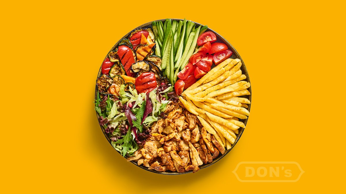 velká porce čerstvého hovězího ,kuřecího či mixu, fritovaná zelenina (lilek, cuketa, paprika, mrkev, brambory), čerstvý salát, okurka, rajčata, citronová šťáva, jemný balkánský sýr, bylinky a koření, omáčka dle výběru, chléba