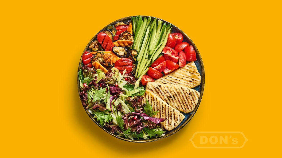 Čerstvý sýr typu Halloumi, fritovaná zelenina (lilek, cuketa, paprika, mrkev, brambory), čerstvý salát, okurka, rajčata, citronová šťáva, bylinky & koření, omáčka dle výběru