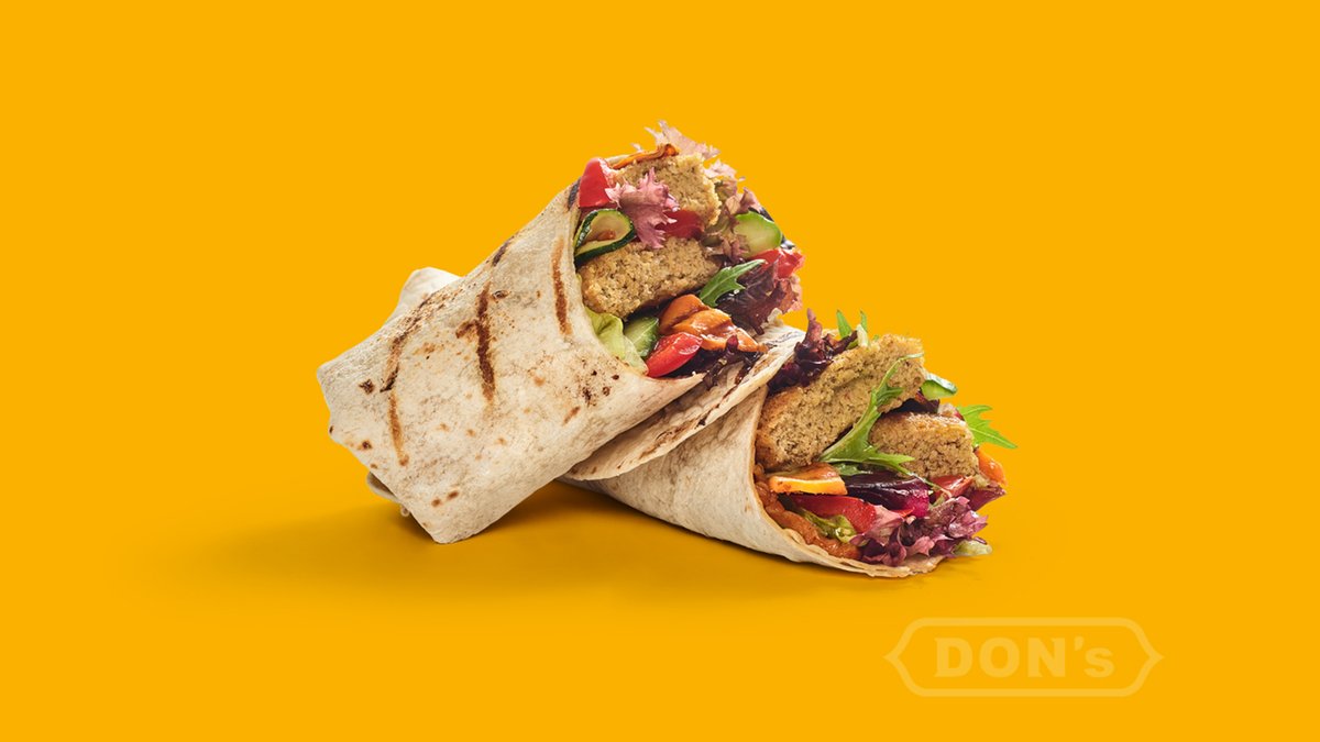 falafel v domácí tortille, fritovaná zelenina (lilek, cuketa, paprika, mrkev, brambory), čerstvý salát, okurka, rajčata, citronová šťáva, bylinky a koření omáčka dle výběru.