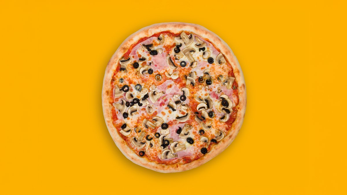 tomato, mozzarella, šunka, žampiony, olivy (1,3,7)